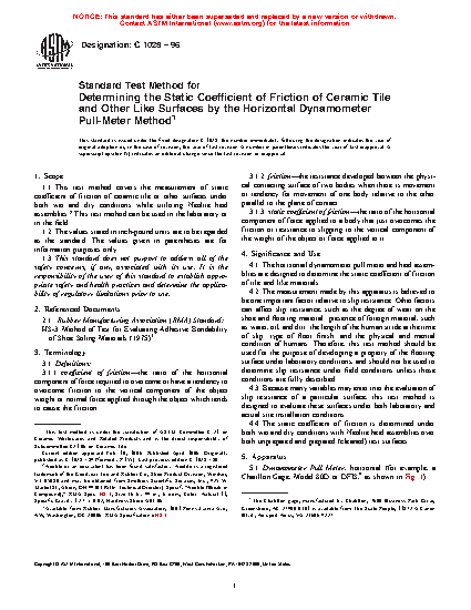 1.1 This test method covers the measurement of static coefficient of friction of ceramic tile or other surfaces under both wet and dry conditions while utilizing Neolite heel assemblies. This test method can be used in the laboratory or in the field.
