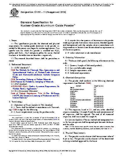 This specification provides the chemical and physical properties and requirements for nuclear-grade aluminum oxide powder intended for fabrication into shapes for nuclear applications. The materials shall conform to physical requirements as to particle size distribution, and specific surface area, and chemical requirements as to loss-on-ignition, and total and elemental concentrations of all impurities. Impurities may include silicaon, iron-chromium-nickel, magnesium, sodium, calcium, hafnium, fluorine, fluorine-chlorine-iodine-bromine, gadolinium, samarium, europium, and dysprosium.