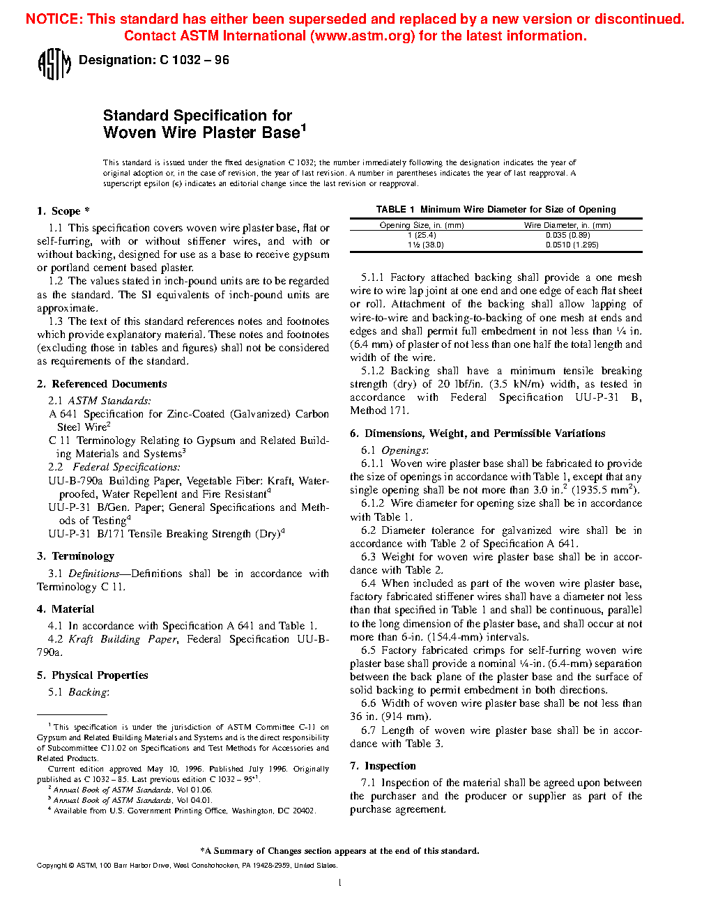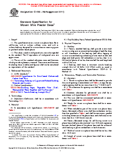 This specification covers woven wire plaster base, flat or self-furring, with or without stiffener wires, and with or without backing, designed for use as a base to receive gypsum or Portland cement based plaster. Backing shall allow lapping of wire-to-wire and backing-to-backing of one mesh at ends and edges and shall have a minimum tensile breaking strength. The wire shall be zinc-coated (galvanized). The weight, size, and diameter of the wire are specified.