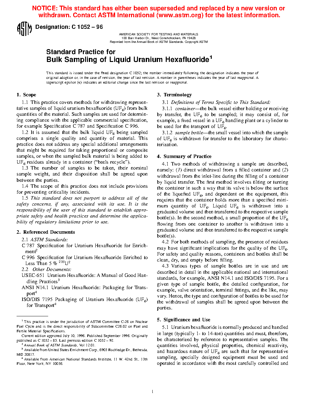 1.2 It is assumed that the bulk liquid UF6 being sampled comprises a single quality and quantity of material. This practice does not address any special additional arrangements that might be required for taking proportional or composite samples. When the sampled bulk material is being added to UF6 residues already in a container (“heels recycle”) additional arrangements are required to avoid cross contamination of the bulk UF6, these are addressed in Specifications C787 and C996.