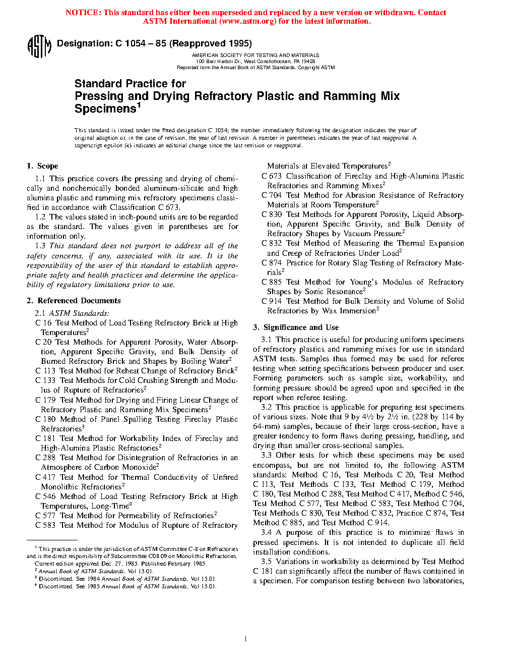 1.1 This practice covers the pressing and drying of chemically and non-chemically bonded alumin-silicate and high-alumina plastic and ramming mix refractory specimens classified in accordance with Classification C673.