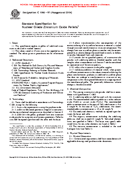 This specification applies to pellets of stabilized zirconium oxide used in nuclear reactors. The chemical composition requirements such as the stabilizing additive (calcium oxide or yttrium oxide), analytical chemistry methods, impurity concentration (including hafnium, boron, gadolinium, samarium, europium, dysprosium, cobalt, silicon, iron, calcium, magnesium, aluminum, titanium, thorium, fluorine, chlorine, bromine, iodine, and hydrogen), and moisture concentration are prescribed. The nuclear grade pellets shall conform to the specified physical requirements which includes the following: physical dimensions, density, mechanical properties and test methods such as compressive test and thermal cycling test, and visual appearance such as end chips, circumferential chips, cracks, and fissures. The requirements for cleanliness before and after sampling and packaging are given.