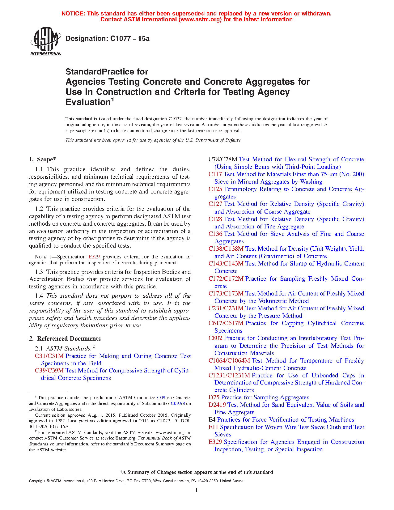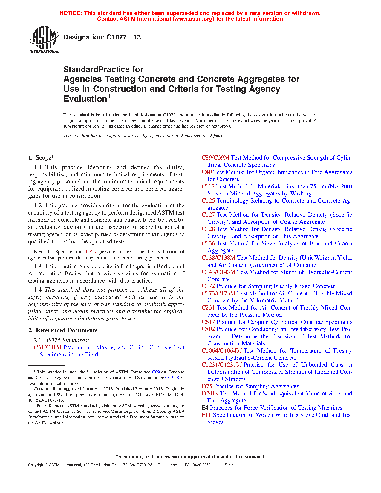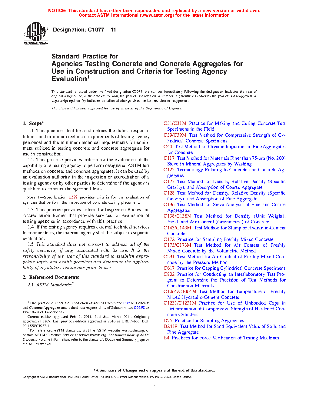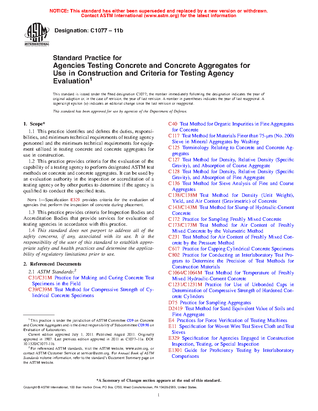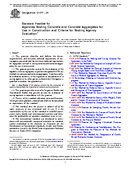 1.2 This practice provides criteria for the evaluation of the capability of a testing agency to perform designated ASTM test methods on concrete and concrete aggregates. It can be used by an evaluation authority in the inspection or accreditation of a testing agency or by other parties to determine if the agency is qualified to conduct the specified tests.