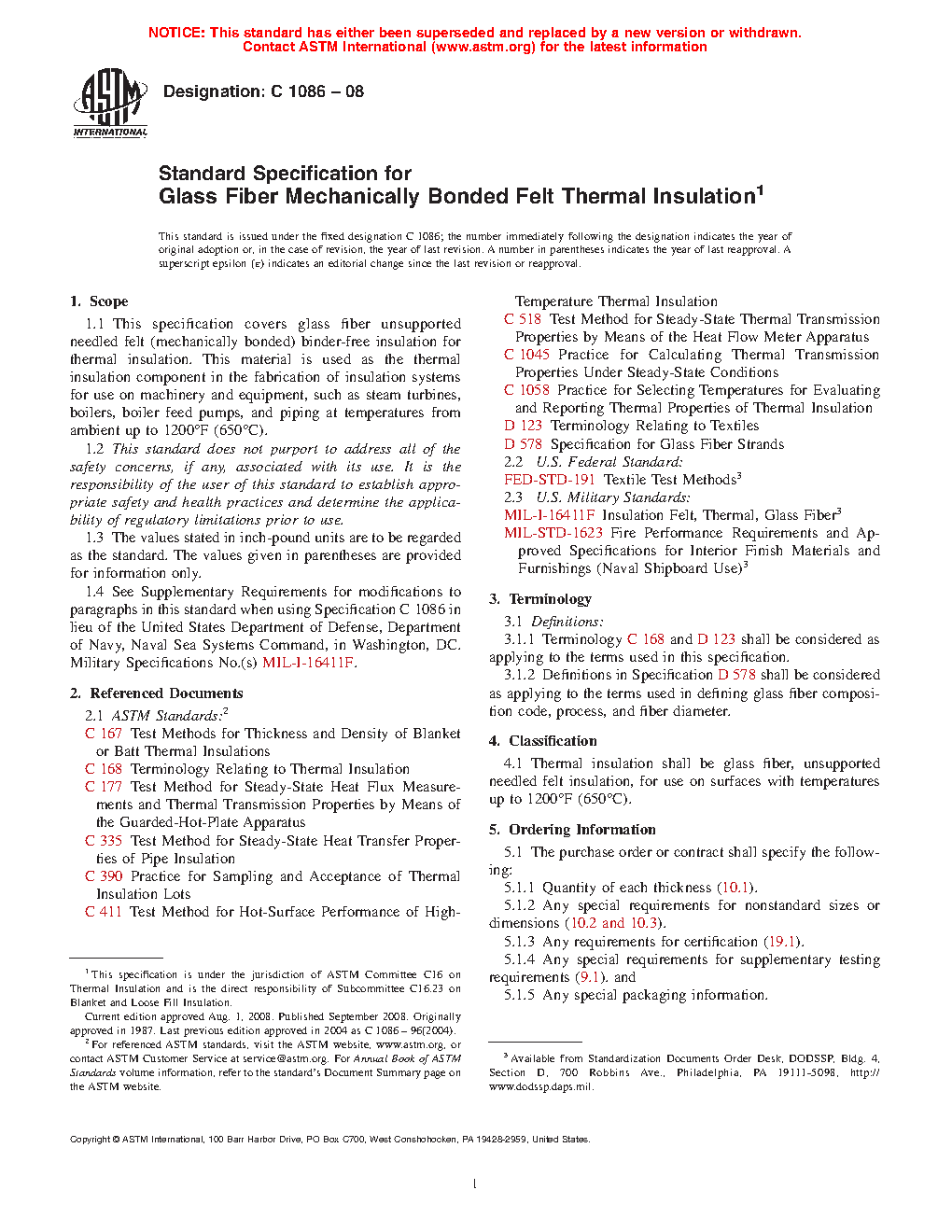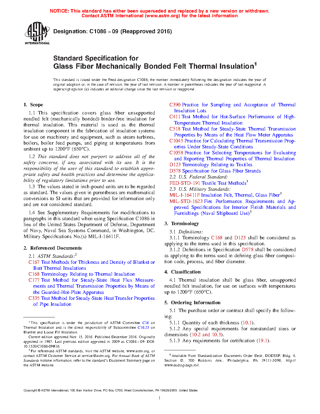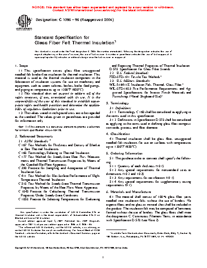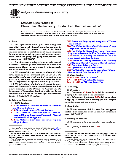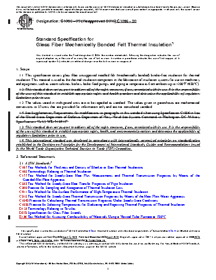 1.1 This specification covers glass fiber unsupported needled felt (mechanically bonded) binder-free insulation for thermal insulation. This material is used as the thermal insulation component in the fabrication of insulation systems for use on machinery and equipment, such as steam turbines, boilers, boiler feed pumps, and piping at temperatures from ambient up to 1200°F (650°C).