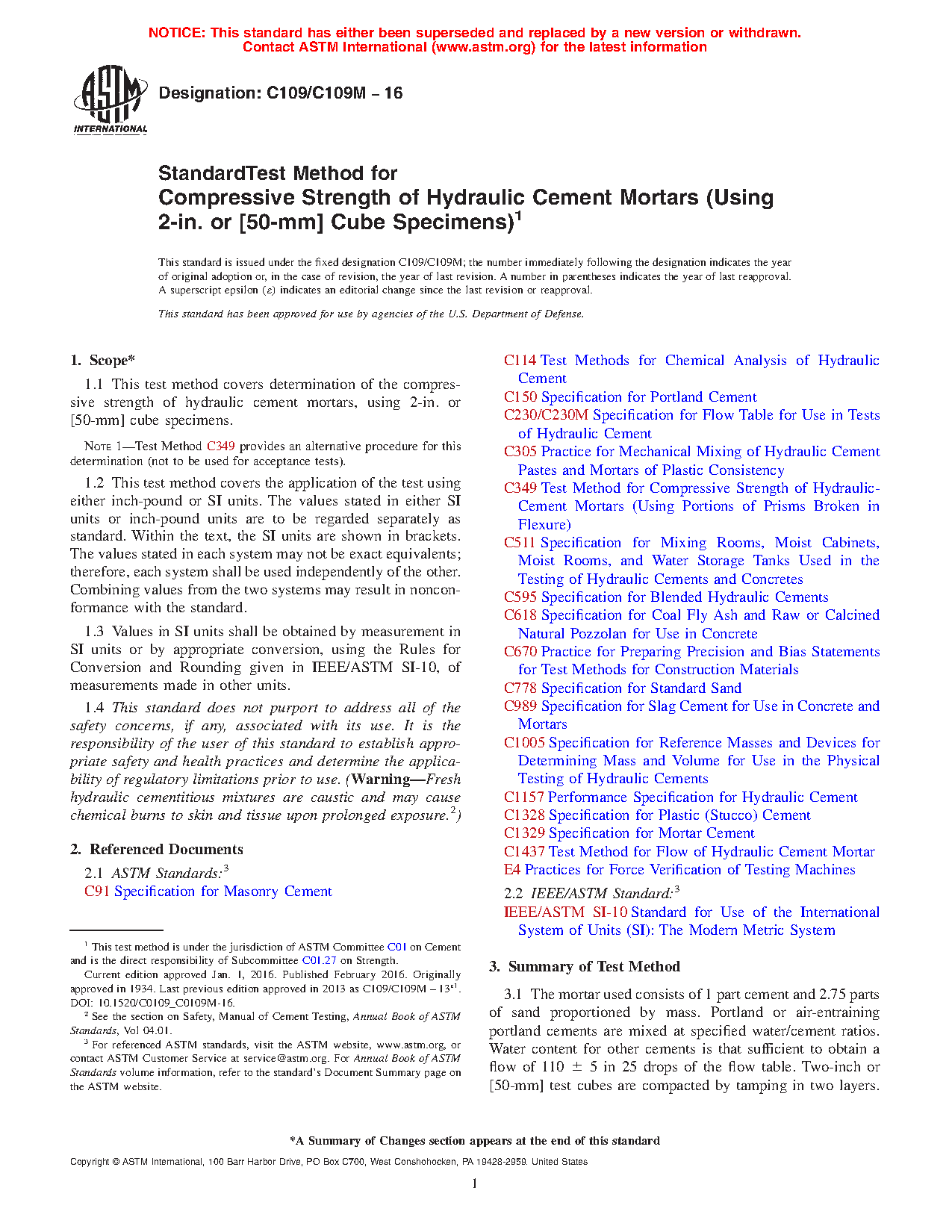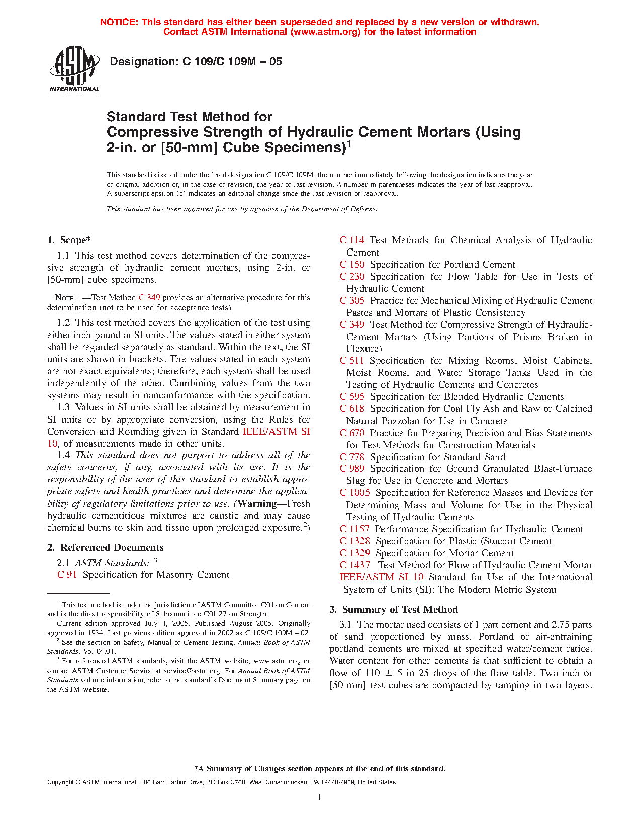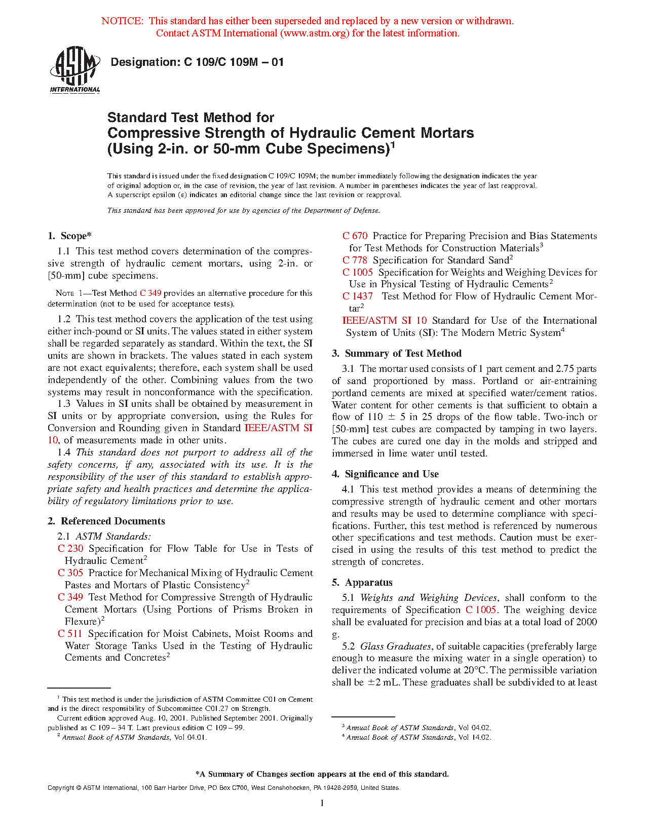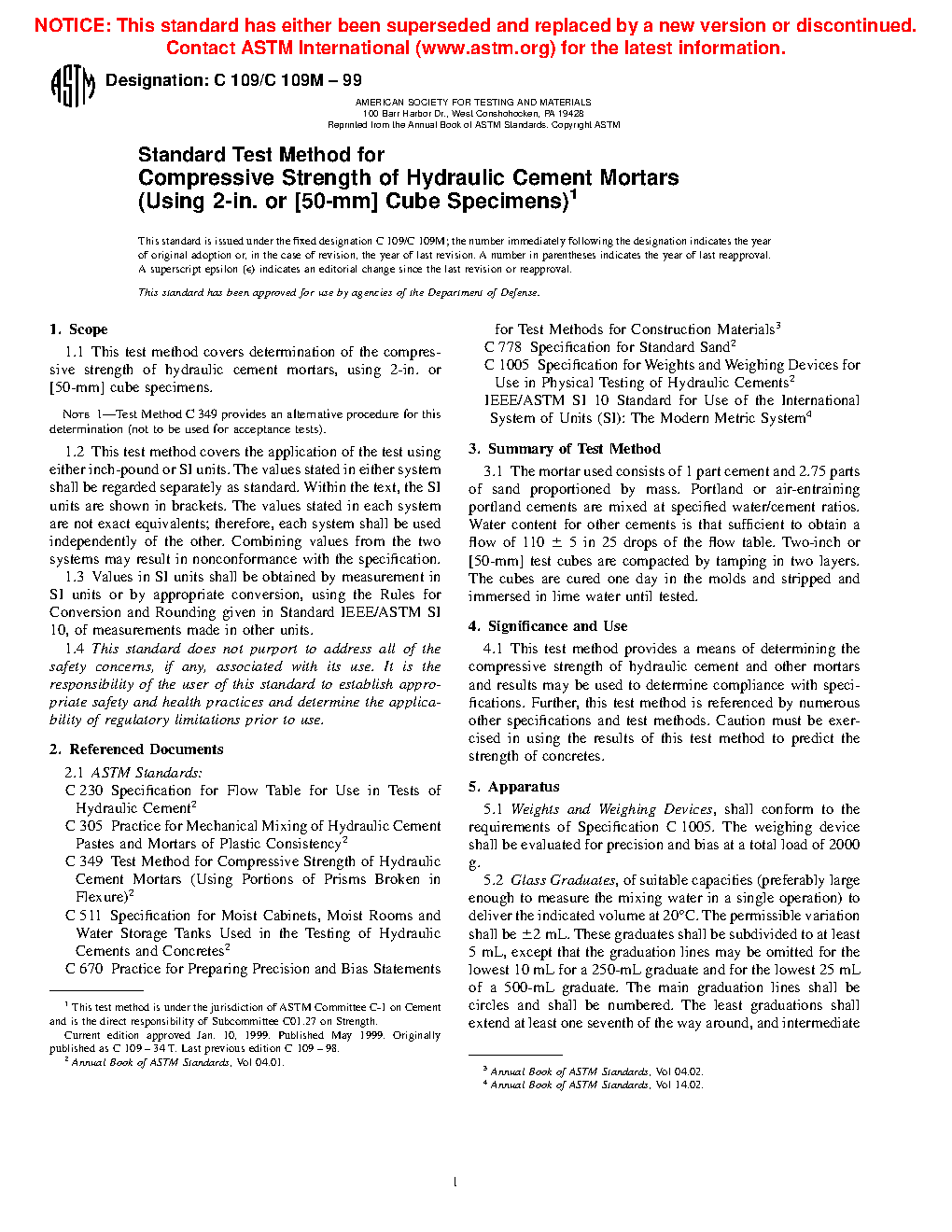 1.1 This test method covers determination of the compressive strength of hydraulic cement mortars, using 2-in. or [50-mm] cube specimens.