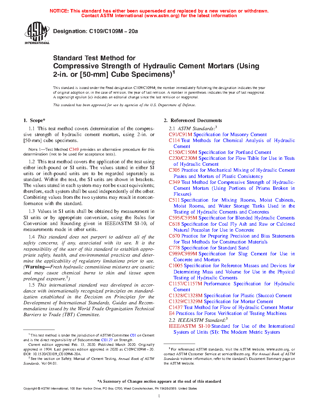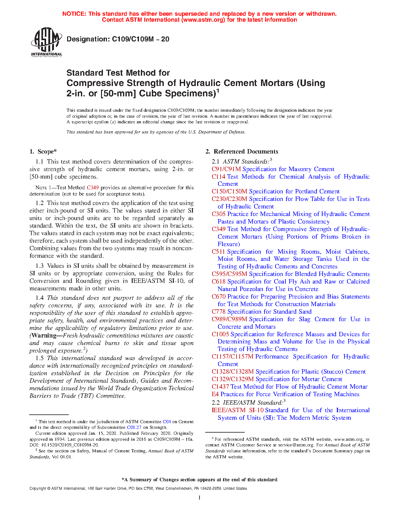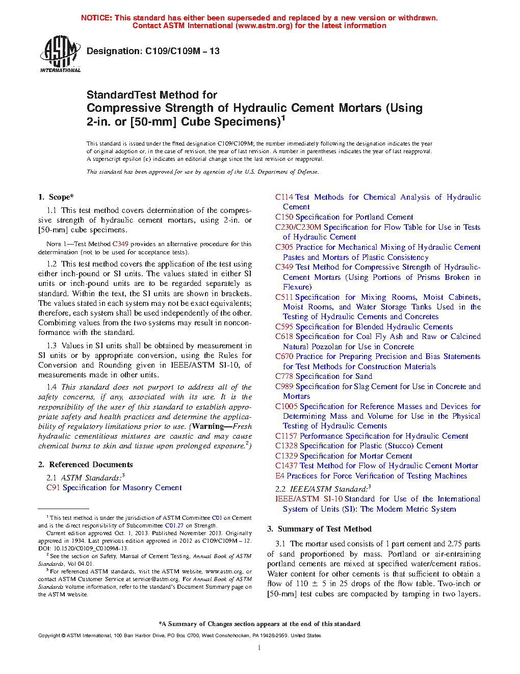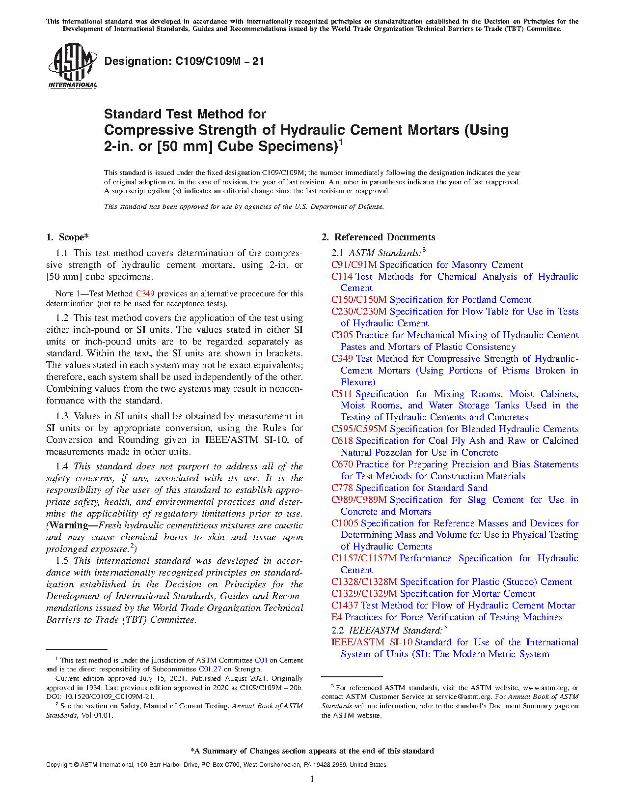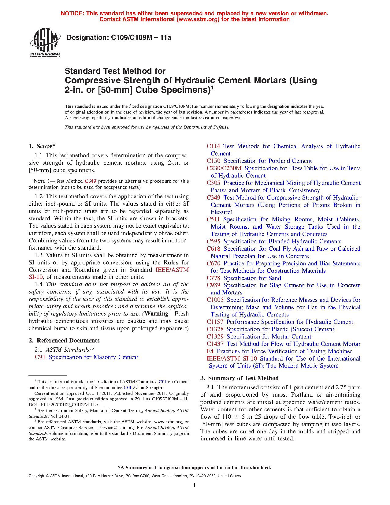 1.1 This test method covers determination of the compressive strength of hydraulic cement mortars, using 2-in. or [50-mm] cube specimens.
