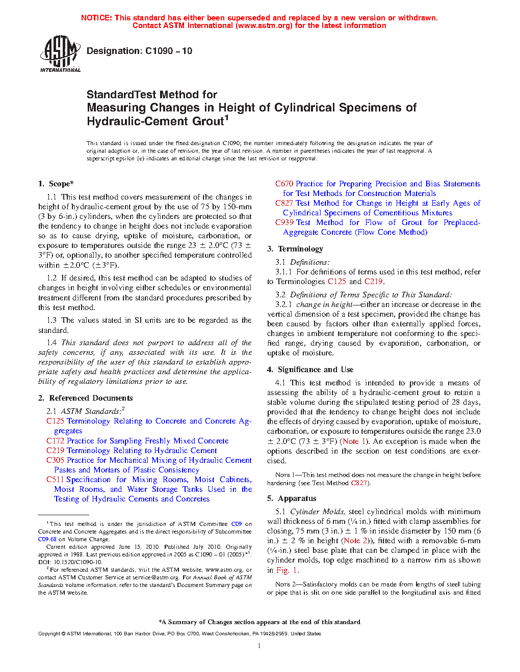 1.1 This test method covers measurement of the changes in height of hydraulic-cement grout by the use of 75 by 150-mm [3 by 6-in.] cylinders, when the cylinders are protected so that the tendency to change in height does not include evaporation so as to cause drying, uptake of moisture, carbonation, or exposure to temperatures outside the range 23 ± 2.0°C [73 ± 3.5°F] or, optionally, to another specified temperature controlled within ±2.0°C [±3.5°F].