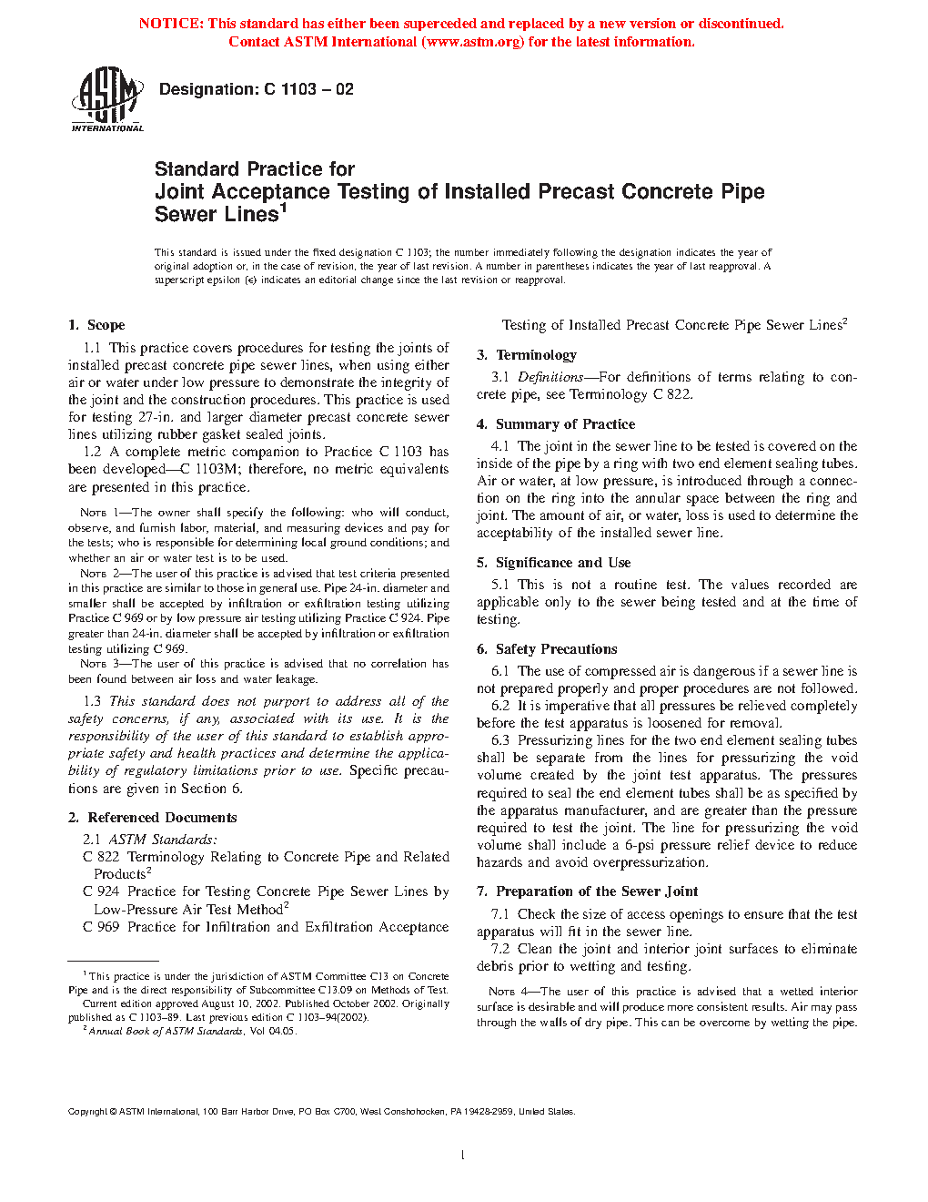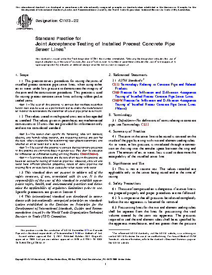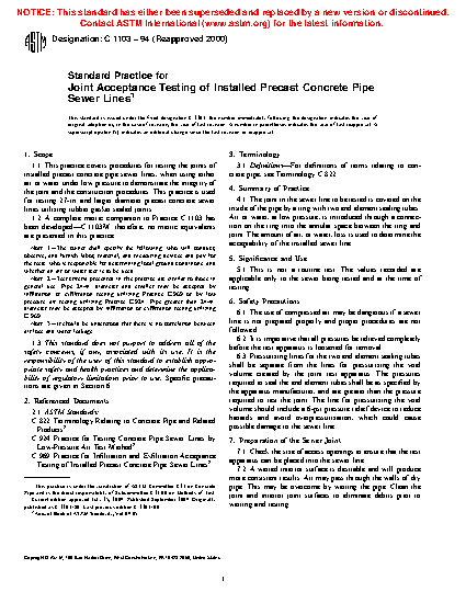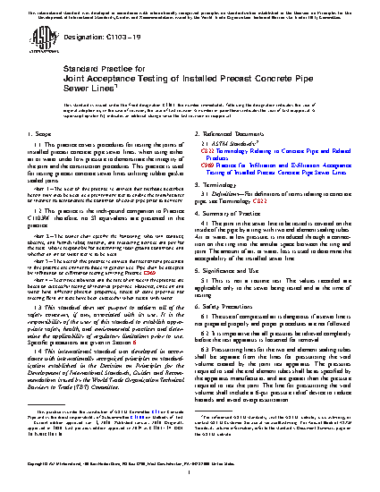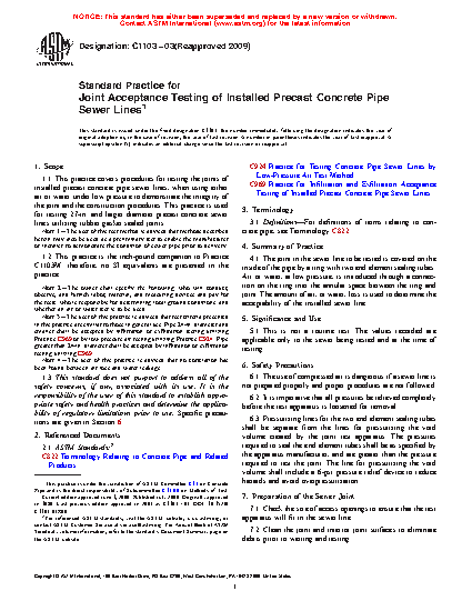 1.1 This practice covers procedures for testing the joints of installed precast concrete pipe sewer lines, when using either air or water under low pressure to demonstrate the integrity of the joint and the construction procedures. This practice is used for testing 27-in. and larger diameter precast concrete sewer lines utilizing rubber gasket sealed joints.