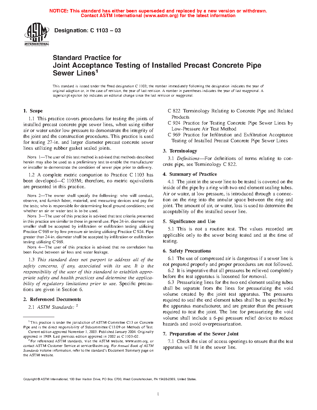 1.1 This practice covers procedures for testing the joints of installed precast concrete pipe sewer lines, when using either air or water under low pressure to demonstrate the integrity of the joint and the construction procedures. This practice is used for testing 27-in. and larger diameter precast concrete sewer lines utilizing rubber gasket sealed joints.