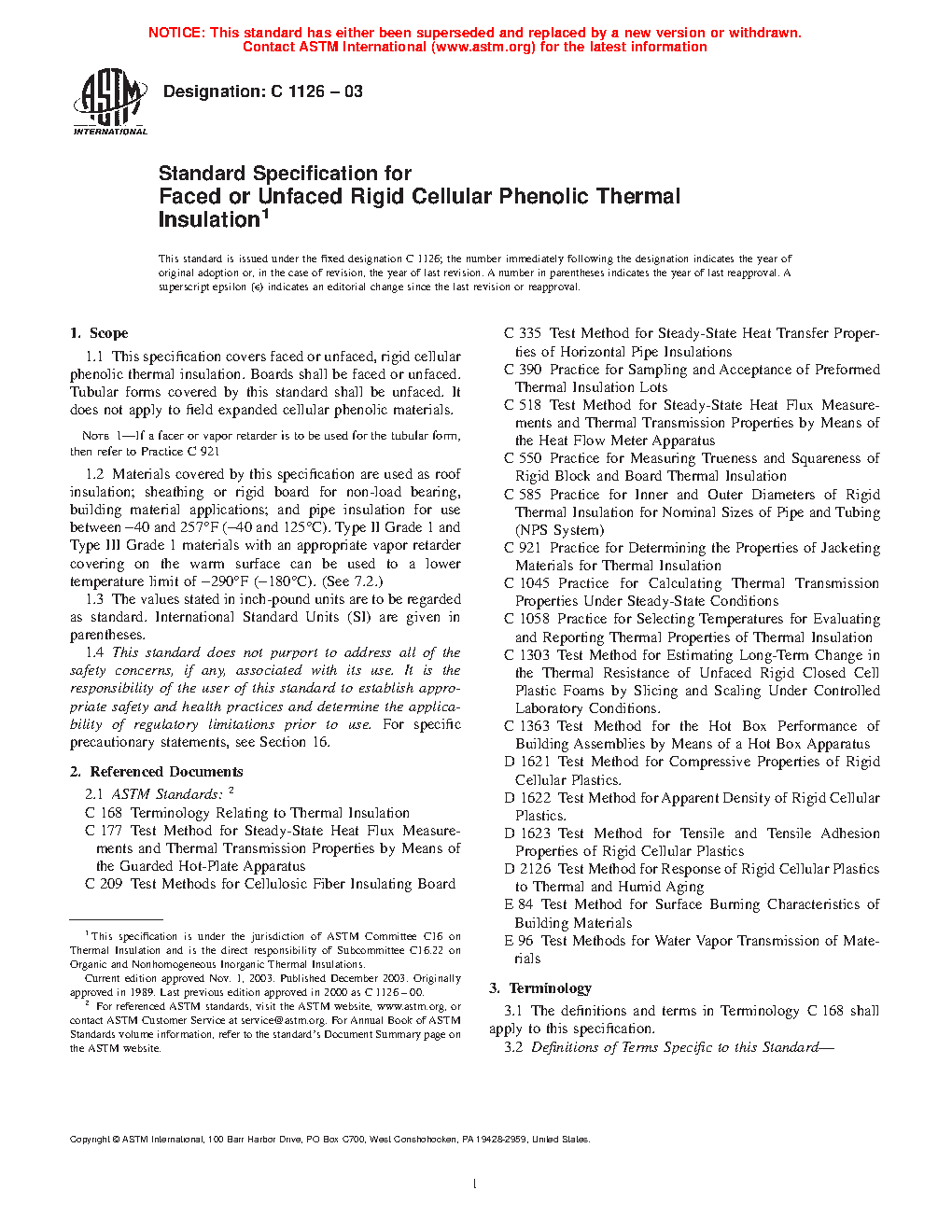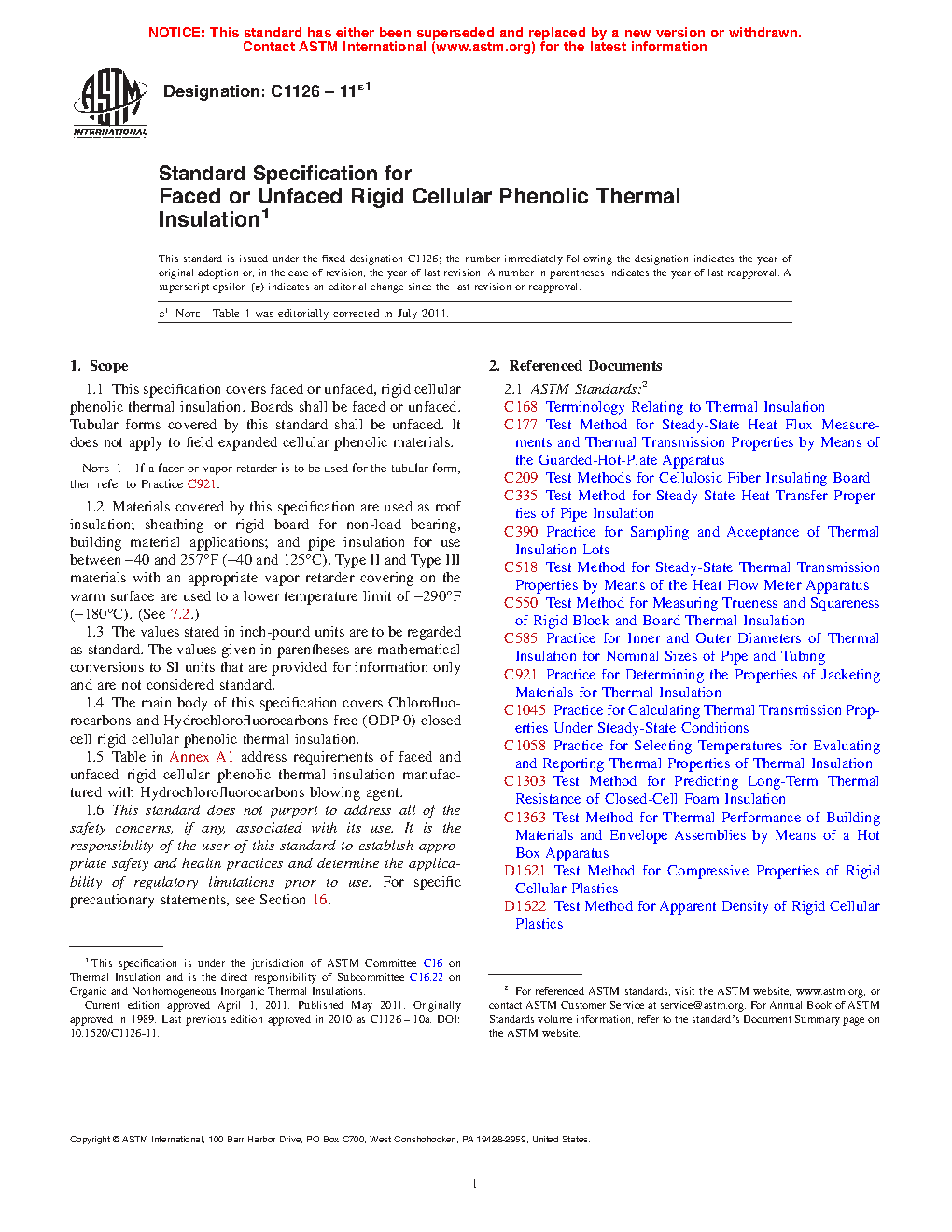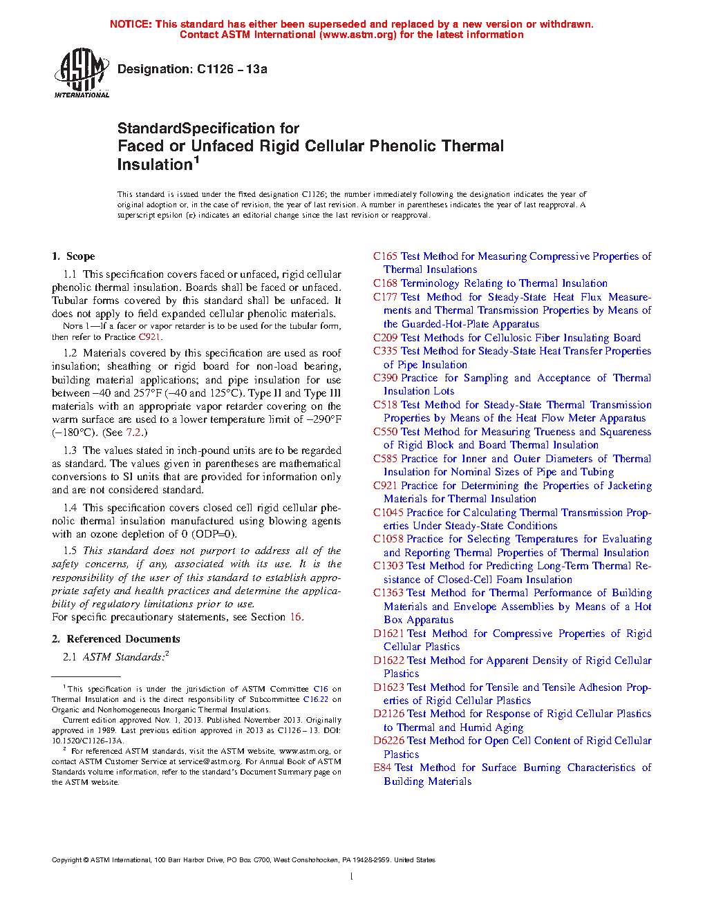 1.4 This specification covers closed cell rigid cellular phenolic thermal insulation manufactured using blowing agents with an ozone depletion potential of 0 (ODP 0).