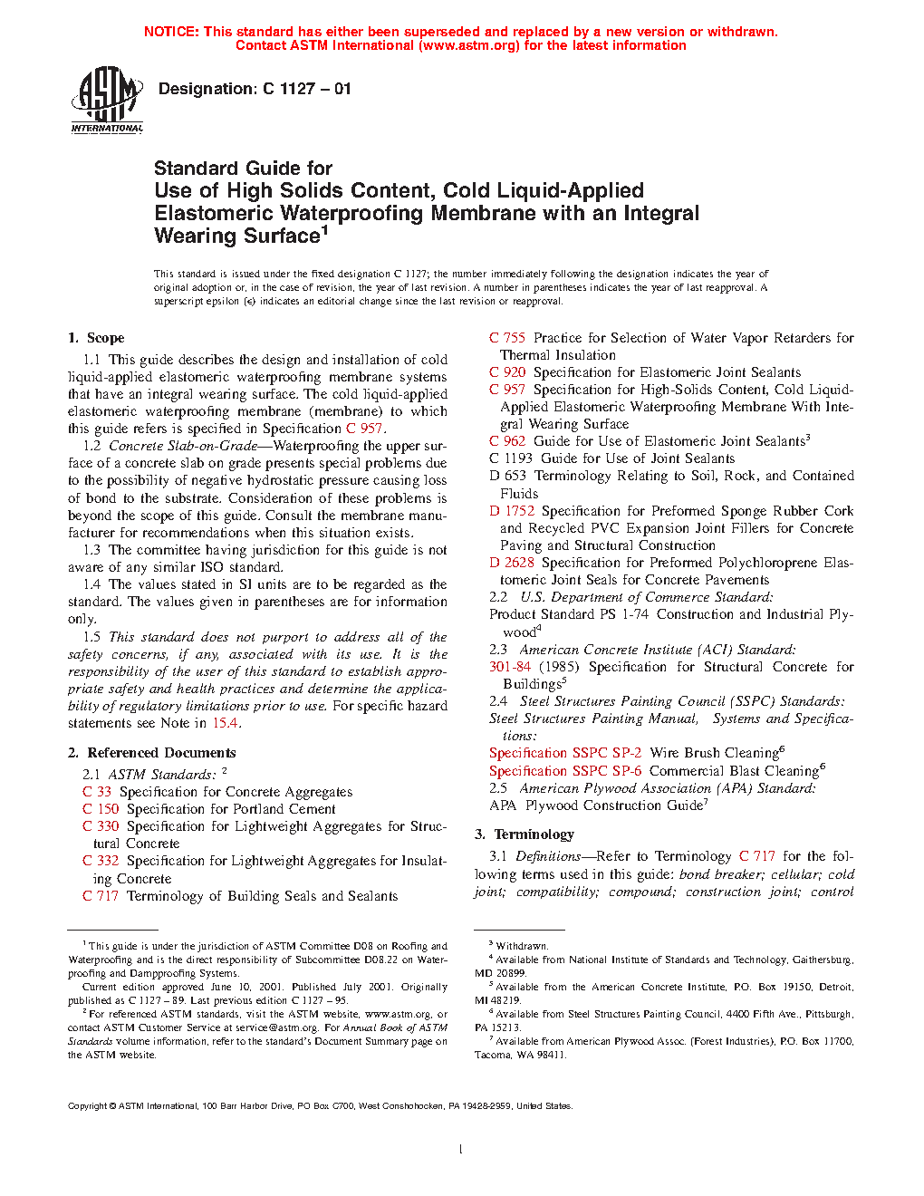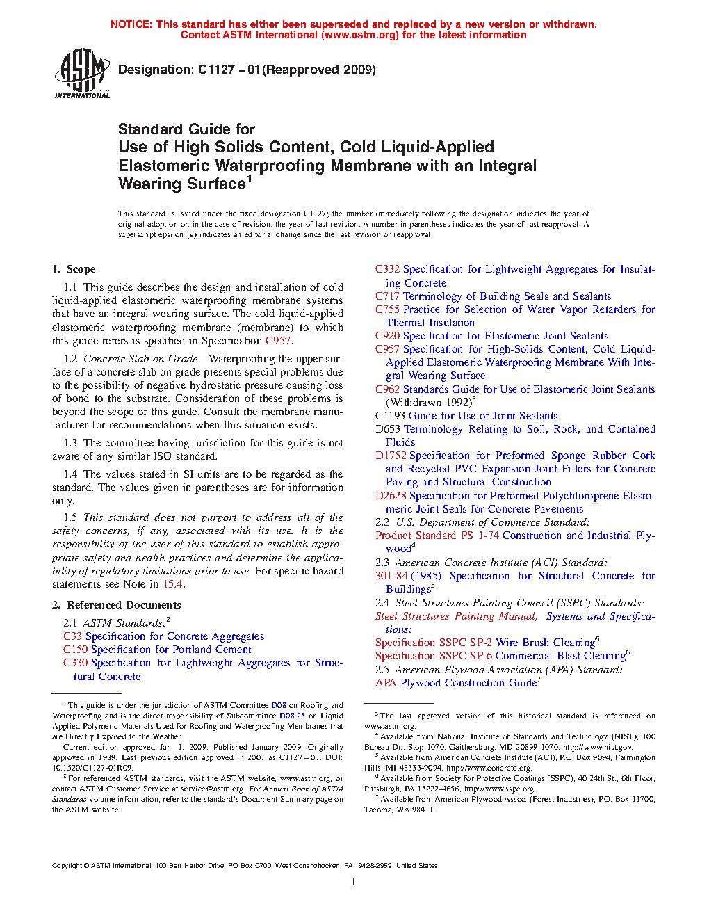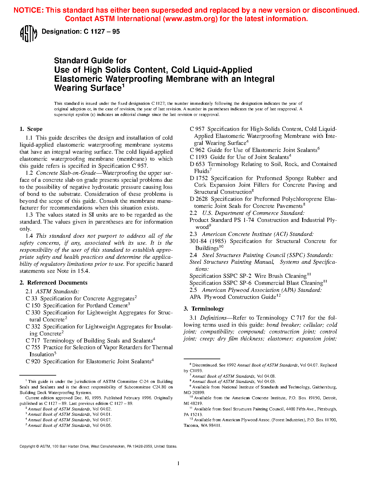 1.1 This guide describes the design and installation of cold liquid-applied elastomeric waterproofing membrane systems that have an integral wearing surface. The cold liquid-applied elastomeric waterproofing membrane (membrane) to which this guide refers is specified in Specification C957.