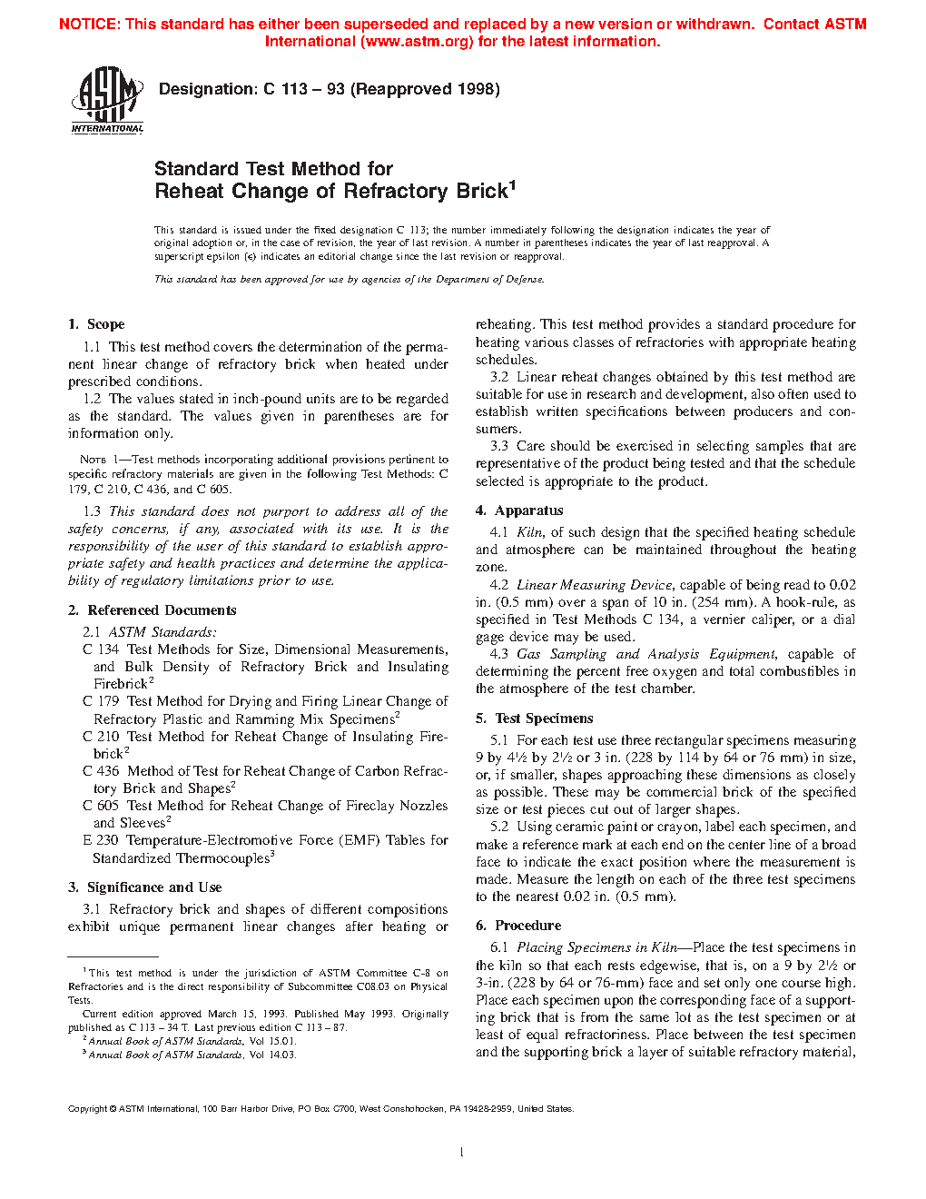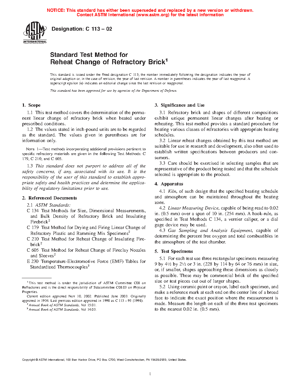 Note 1-Test methods incorporating additional provisions pertinent to specific refractory materials are given in the following Test Methods: C179, C210, C436, and C605.1.3 This standard does not purport to address all of the safety problems, if any, associated with its use. It is the responsibility of the user of this standard to establish appropriate safety and health practices and determine the applicability of regulatory limitations prior to use.