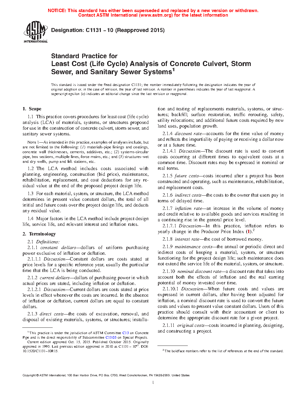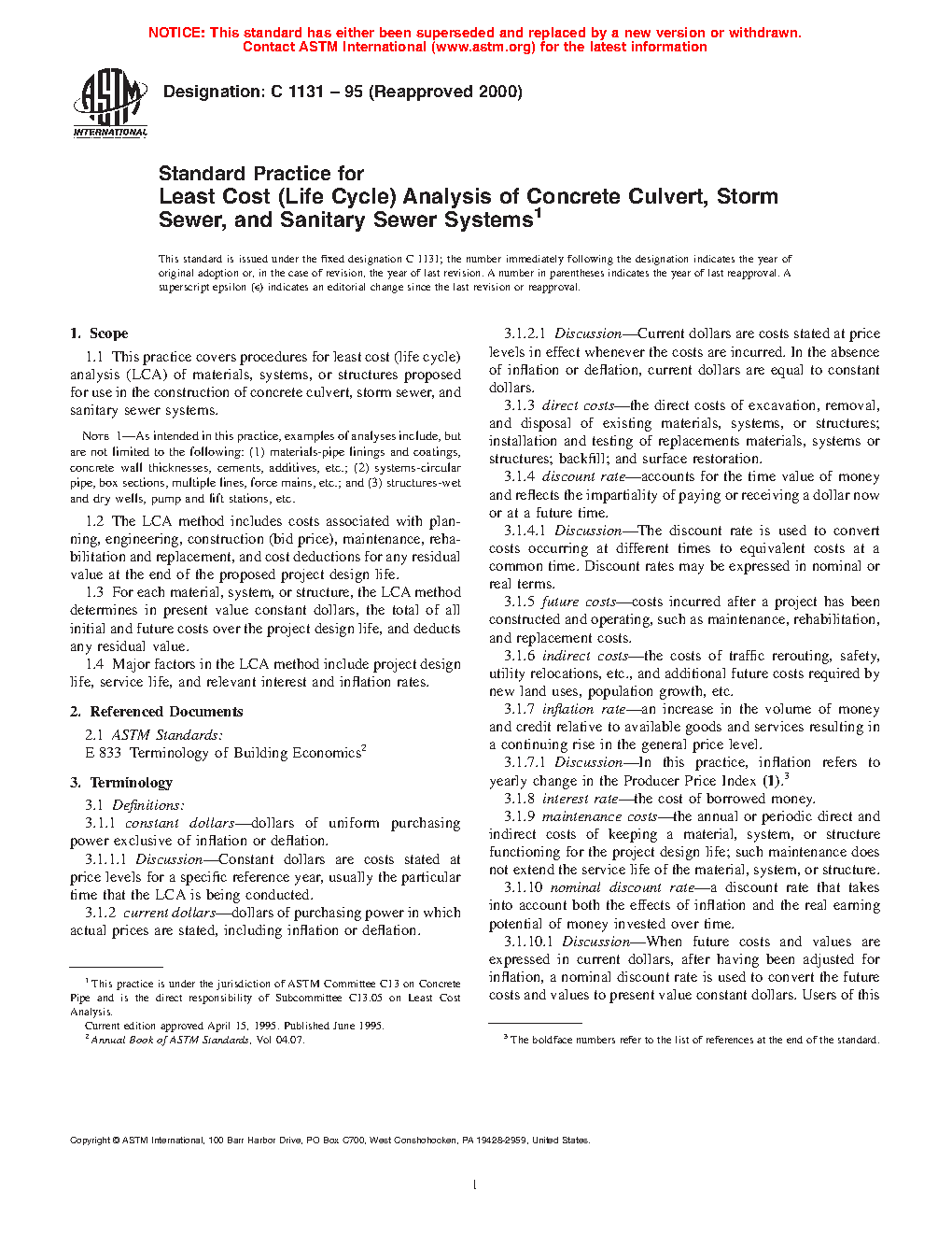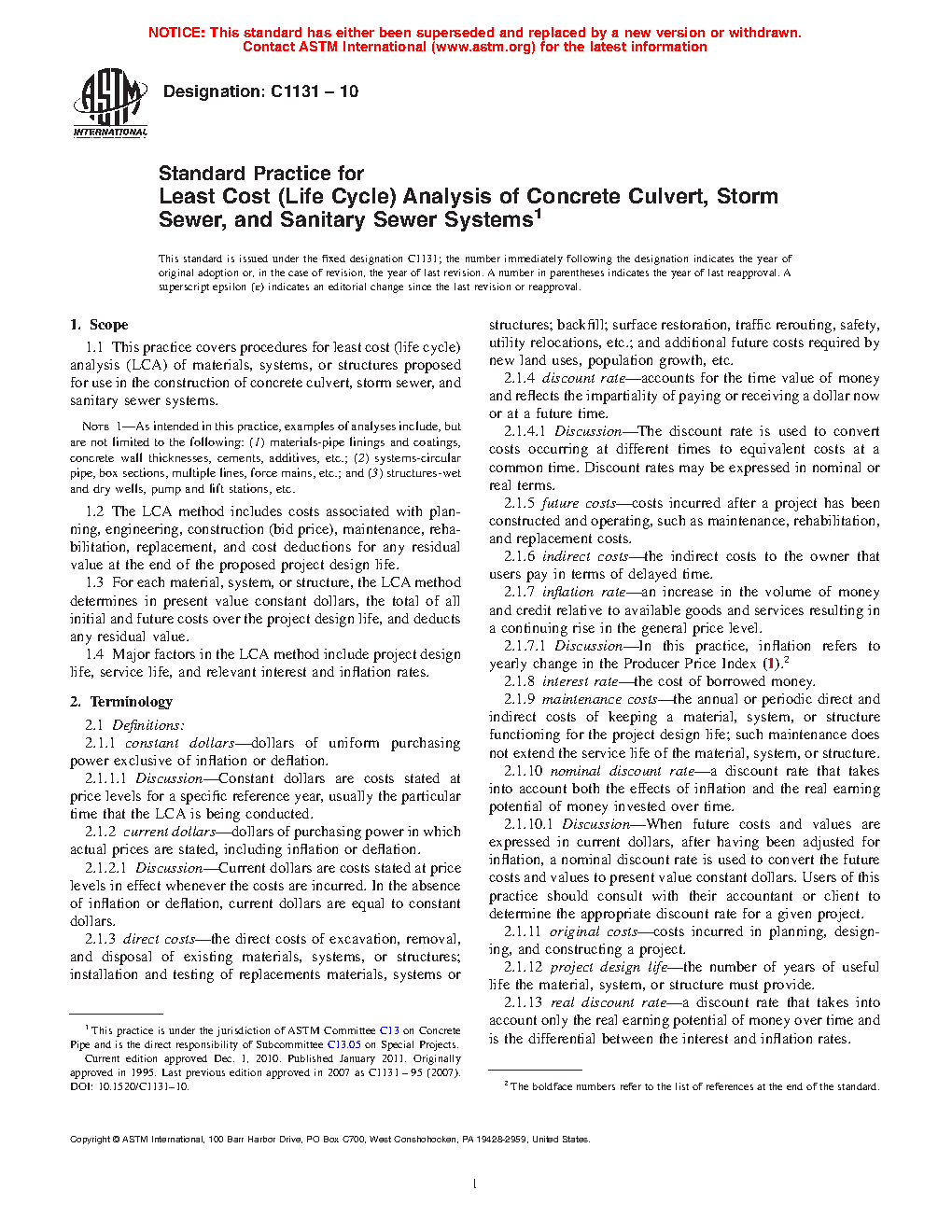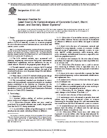 1.1 This practice covers procedures for least cost (life cycle) analysis (LCA) of materials, systems, or structures proposed for use in the construction of concrete culvert, storm sewer, and sanitary sewer systems.