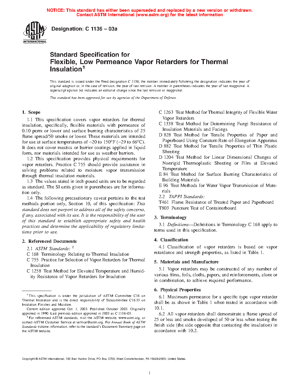 1.3 This specification provides physical requirements for vapor retarders. Practice C755 provides assistance in solving problems related to moisture vapor transmission through thermal insulation materials.