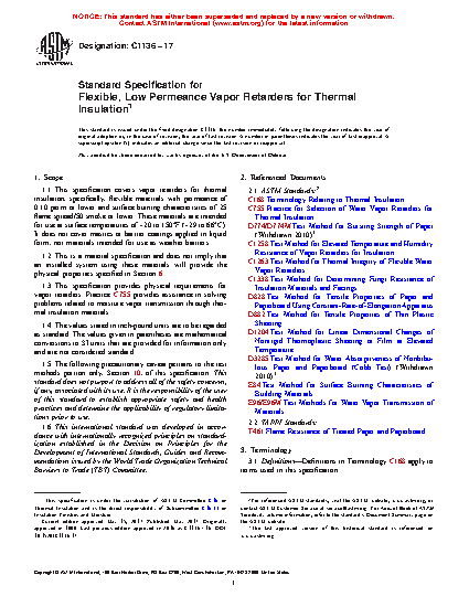 1.1 This specification covers vapor retarders for thermal insulation, specifically, flexible materials with permeance of 0.10 perm or lower and surface burning characteristics of 25 flame spread/50 smoke or lower. These materials are intended for use at surface temperatures of −20 to 150°F (−29 to 66°C). It does not cover mastics or barrier coatings applied in liquid form, nor materials intended for use as weather barriers.