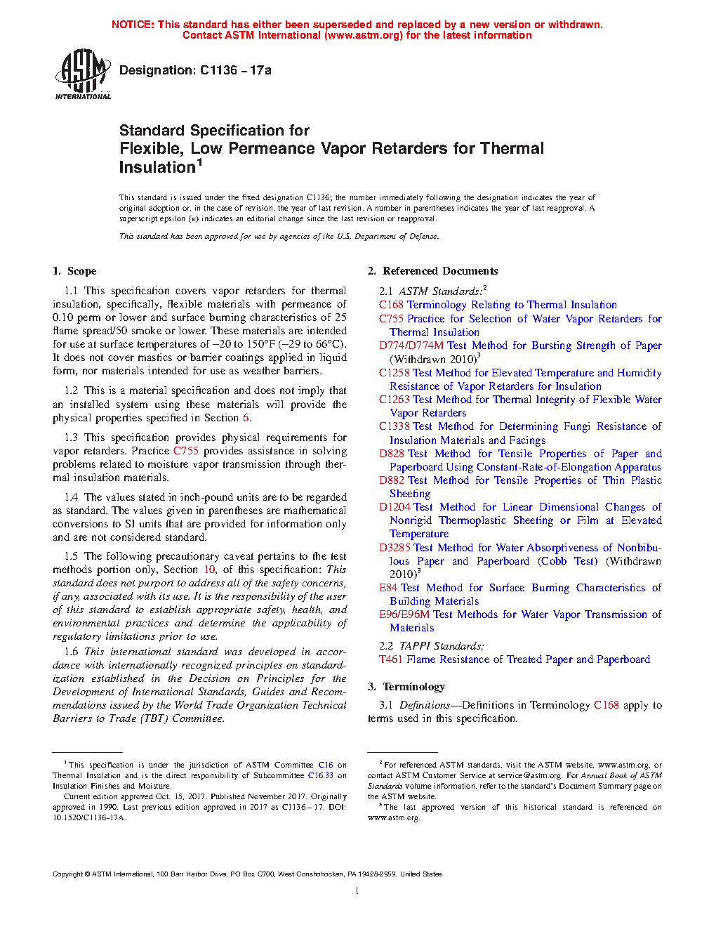 1.1 This specification covers vapor retarders for thermal insulation, specifically, flexible materials with permeance of 0.15 perm (8.63 ng·Pa–1 · s–1 · m–2) or lower and surface burning characteristics of 25 flame spread/50 smoke or lower. These materials are intended for use at surface temperatures of -20 to 150°F (-29 to 66°C). It does not cover mastics or barrier coatings applied in liquid form, nor materials intended for use as weather barriers.