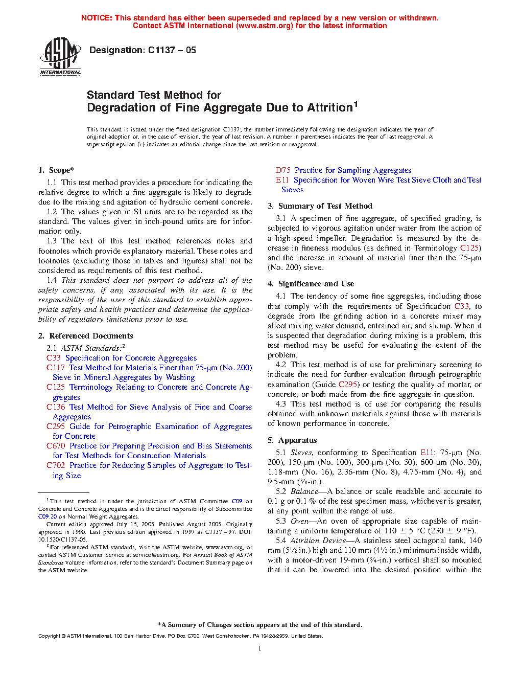 1.1 This test method provides a procedure for indicating the degree to which a fine aggregate may be subject to degradation due to the mixing and agitation of portland cement concrete.