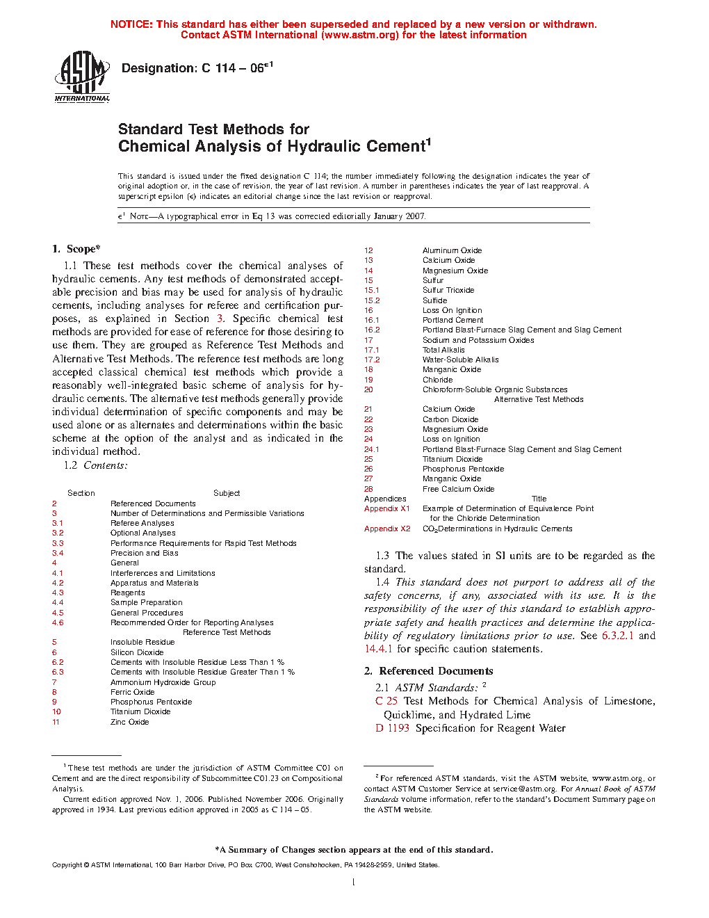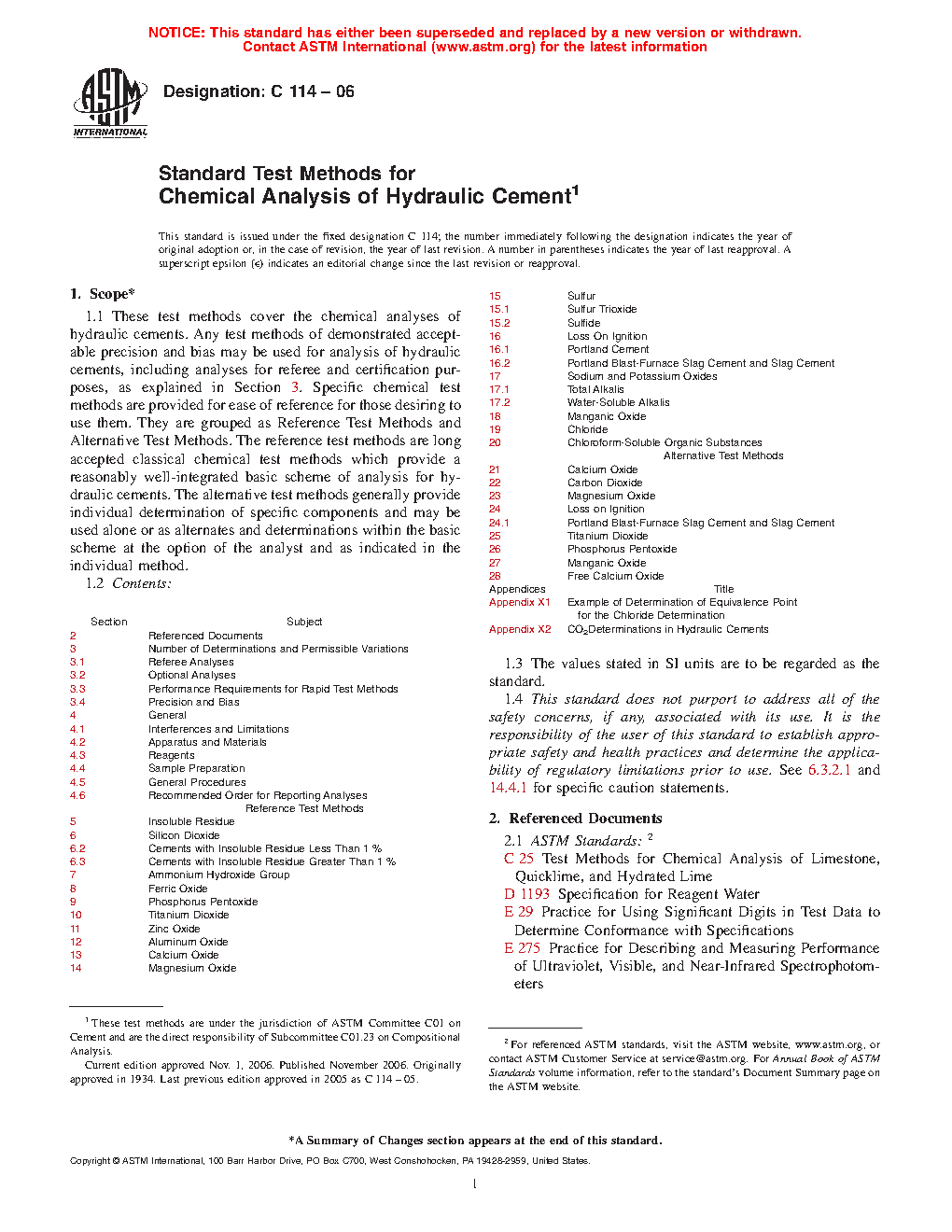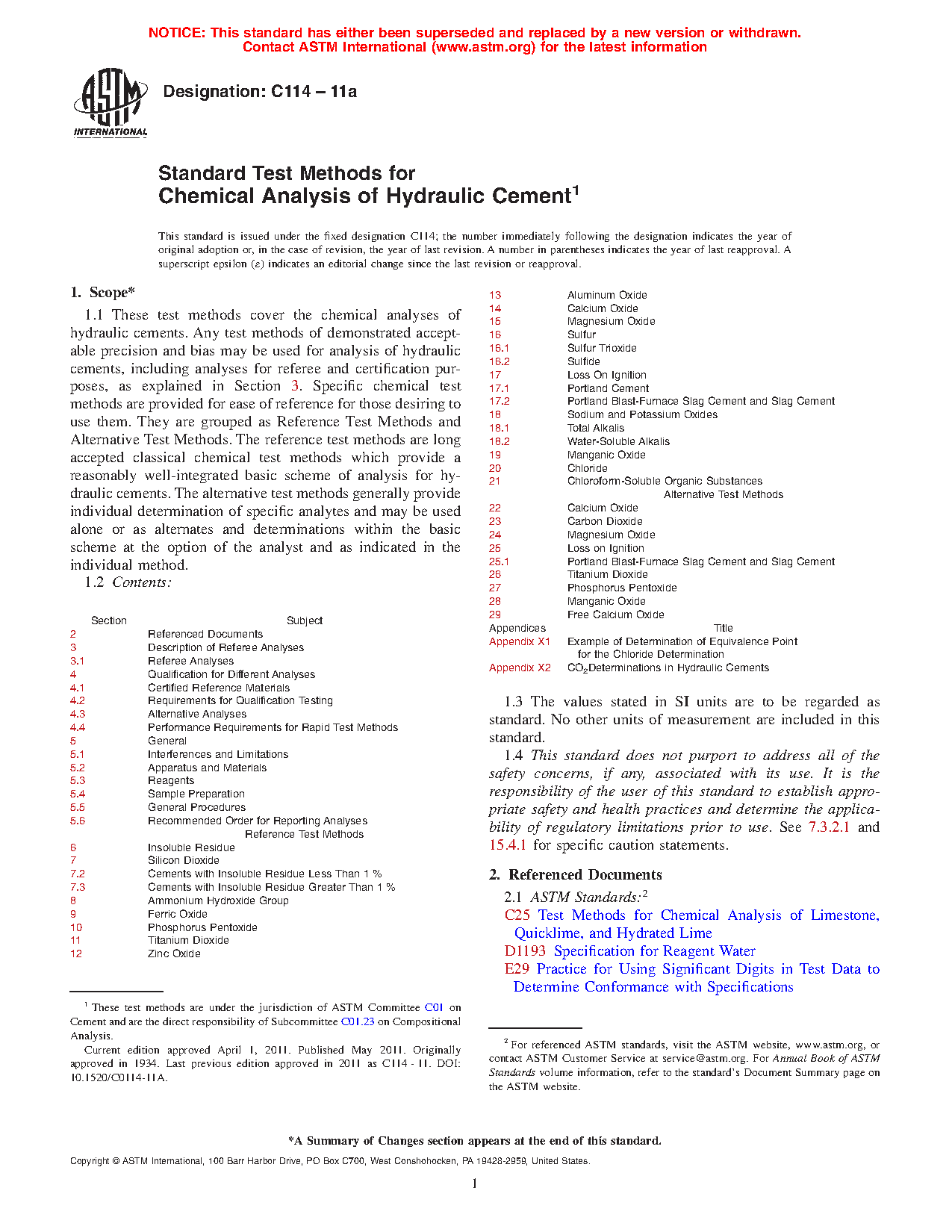 1.1 These test methods cover the chemical analyses of hydraulic cements. Any test methods of demonstrated acceptable precision and bias may be used for analysis of hydraulic cements, including analyses for referee and certification purposes, as explained in Section . Specific chemical test methods are provided for ease of reference for those desiring to use them. They are grouped as Reference Test Methods and Alternative Test Methods. The reference test methods are long accepted wet chemical test methods which provide a reasonably well-integrated basic scheme of analysis for hydraulic cements. The alternative test methods generally provide individual determination of specific components and may be used alone or as alternates and determinations within the basic scheme at the option of the analyst and as indicated in the individual method.