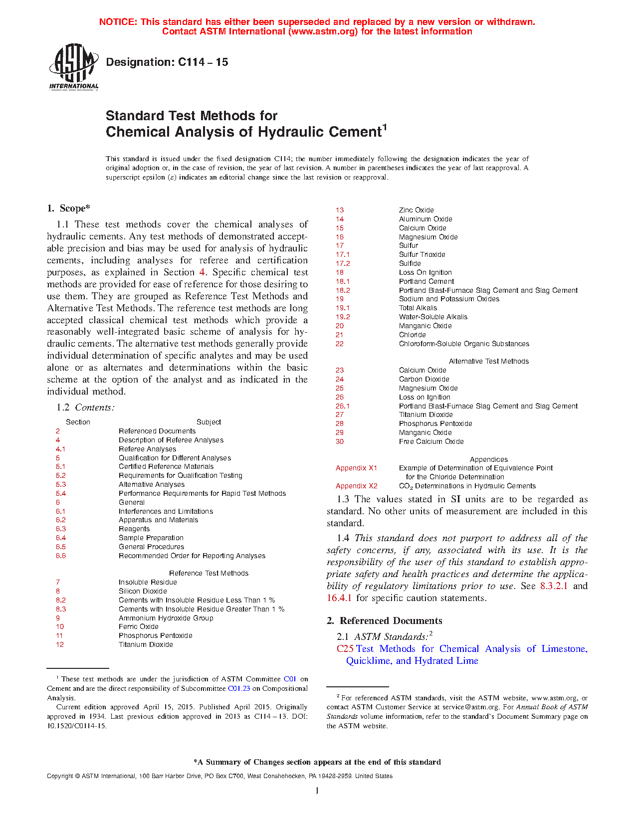 1.1 These test methods cover the chemical analyses of hydraulic cements. Any test methods of demonstrated acceptable precision and bias may be used for analysis of hydraulic cements, including analyses for referee and certification purposes, as explained in Section 3. Specific chemical test methods are provided for ease of reference for those desiring to use them. They are grouped as Reference Test Methods and Alternative Test Methods. The reference test methods are long accepted classical chemical test methods which provide a reasonably well-integrated basic scheme of analysis for hydraulic cements. The alternative test methods generally provide individual determination of specific components and may be used alone or as alternates and determinations within the basic scheme at the option of the analyst and as indicated in the individual method.
