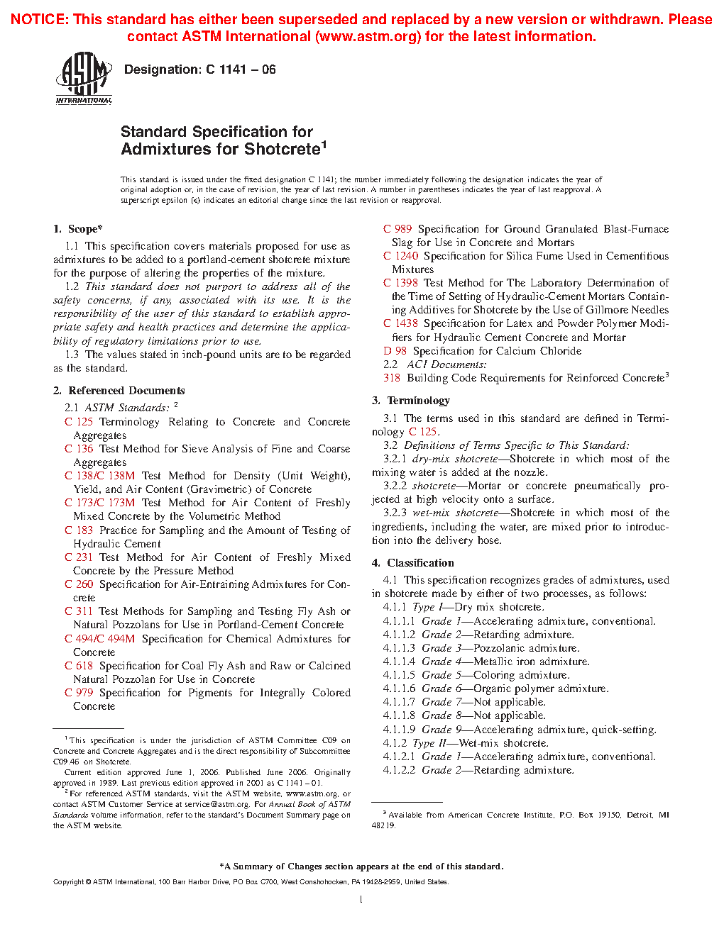 This specification covers materials proposed for use as admixtures to be added to a Portland-cement shotcrete mixture for the purpose of altering the properties of the mixture. The material shall be classified as Type I (dry mix shotcrete, with Grades 1-9) and Type II (wet-mix shotcrete, with Grades 1-9). Each of the grades shall be further classified by identifying it accordingly as Class A (liquid) or Class B (non-liquid). Shotcrete admixtures shall conform to the requirements for the applicable type and grade. Samples shall be either grab or composite samples, as specified or required by this specification. The number of tests and retests to be performed on the specified materials shall be the number stipulated in the referenced standard.