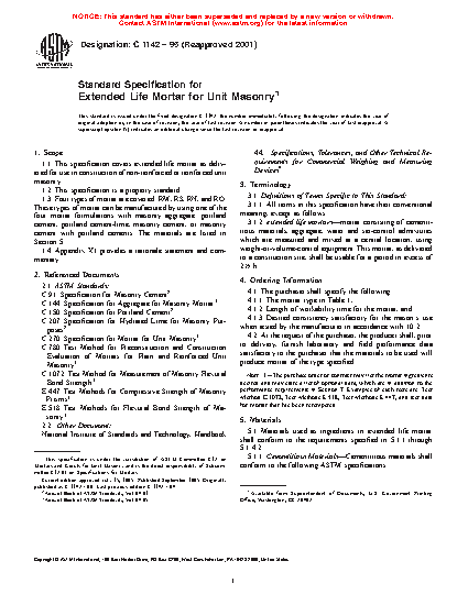 1.1 This specification covers extended life mortar as delivered for use in construction of non-reinforced or reinforced unit masonry.