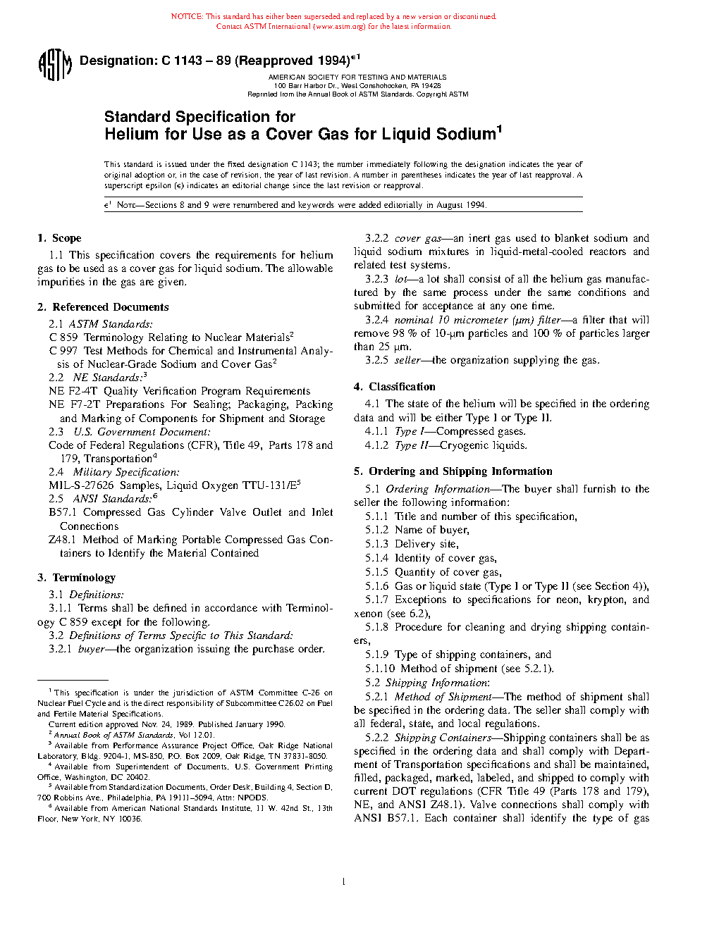 Standard Specification for Helium for Use as a Cover Gas for Liquid Sodium (Withdrawn 2000)