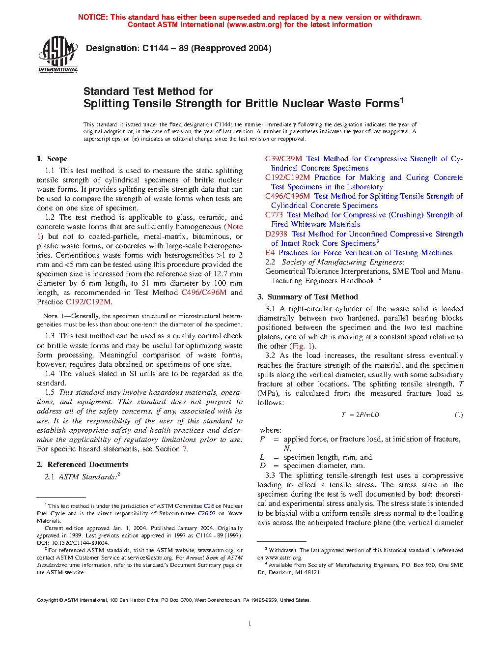 1.1 This test method is used to measure the static splitting tensile strength of cylindrical specimens of brittle nuclear waste forms. It provides splitting tensile-strength data that can be used to compare the strength of waste forms when tests are done on one size of specimen.