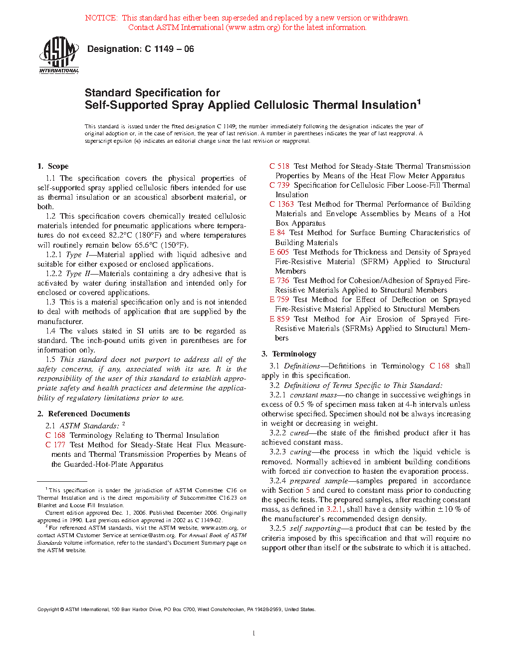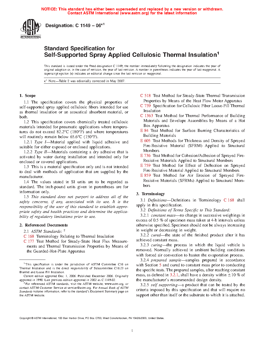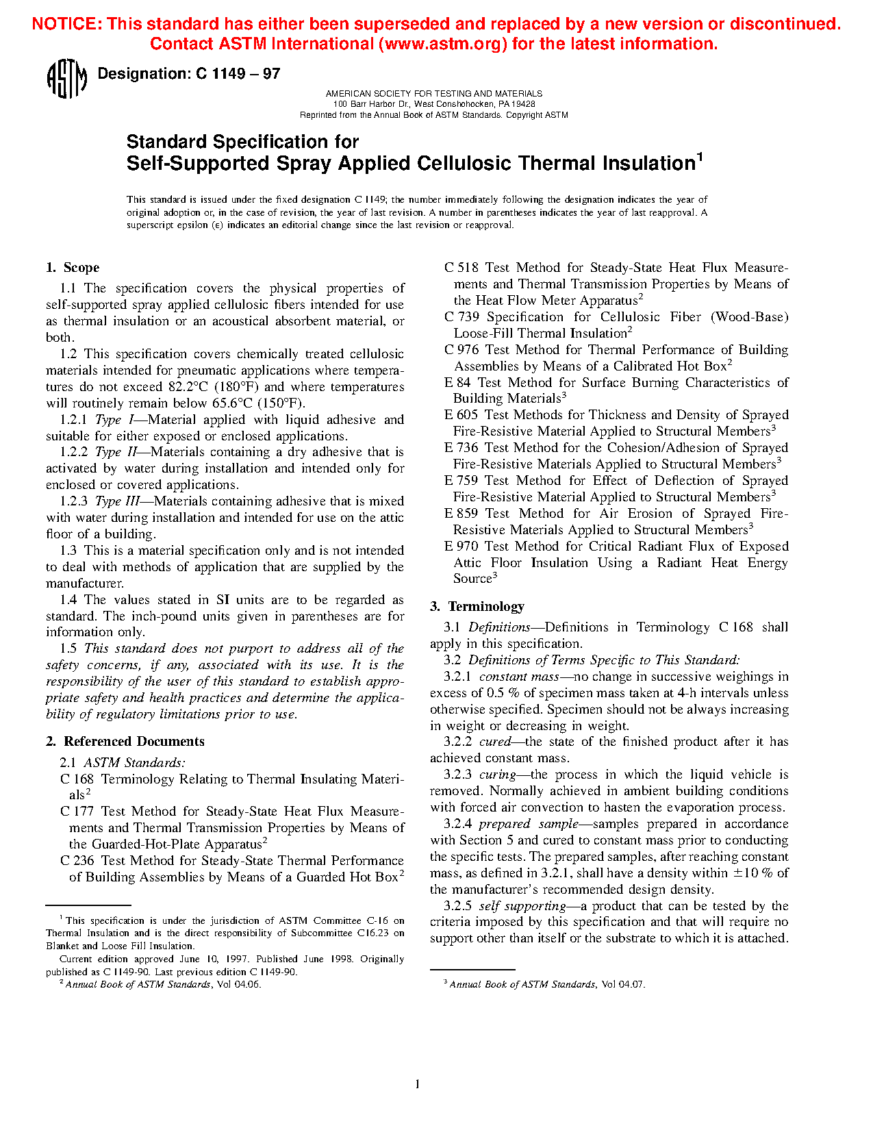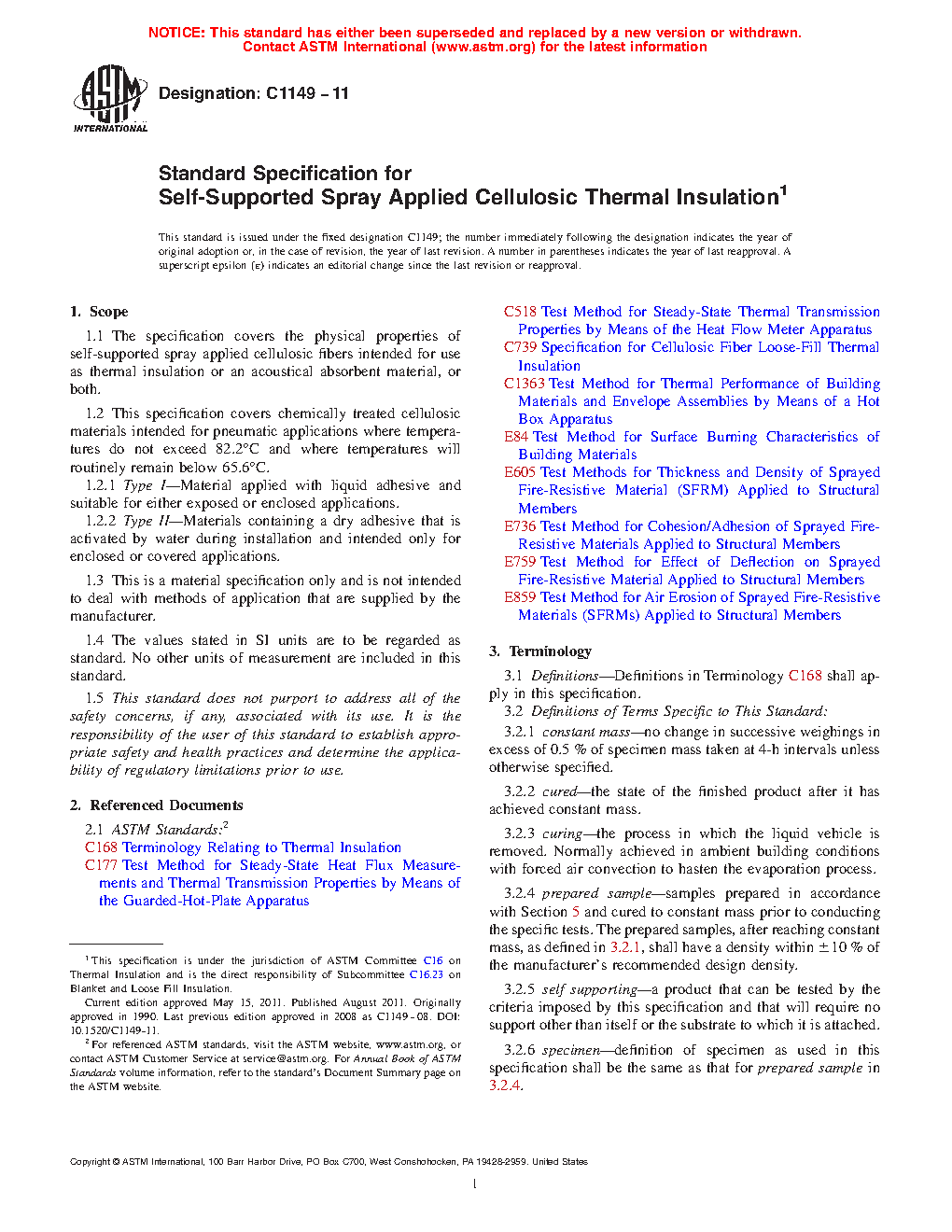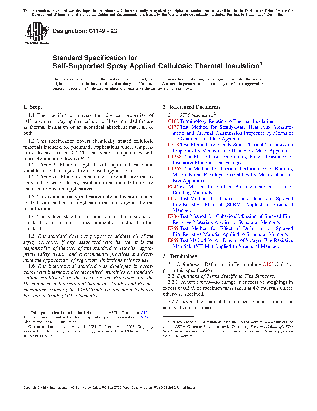 1.1 The specification covers the physical properties of self-supported spray applied cellulosic fibers intended for use as thermal insulation or an acoustical absorbent material, or both.