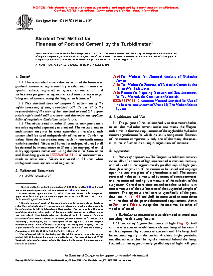1.1 This test method covers determination of the fineness of portland cement as represented by a calculated measure of specific surface, expressed as square centimetres of total surface area per gram, or square metres of total surface area per kilogram, of cement, using the Wagner turbidimeter.2
