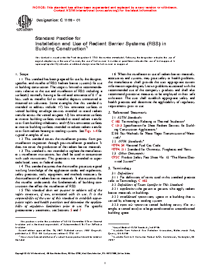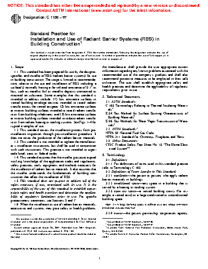 1.1 This standard has been prepared for use by the designer, specifier, and installer of RBS (radiant barrier systems) for use in building construction. The scope is limited to recommendations relative to the use and installation of RBS including a surface(s) normally having a far-infrared emittance of 0.1 or less, such as metallic foil or metallic deposits unmounted or mounted on substrates. Some examples that this standard is intended to address include: (1) low emittance surfaces in vented building envelope cavities intended to retard radiant transfer across the vented airspace; (2) low emittance surfaces at interior building surfaces intended to retard radiant transfer to or from building inhabitants; and (3) low emittance surfaces at interior building surfaces intended to reduce radiant transfer to or from radiant heating or cooling systems. See Figs.1-4 for typical examples of use.