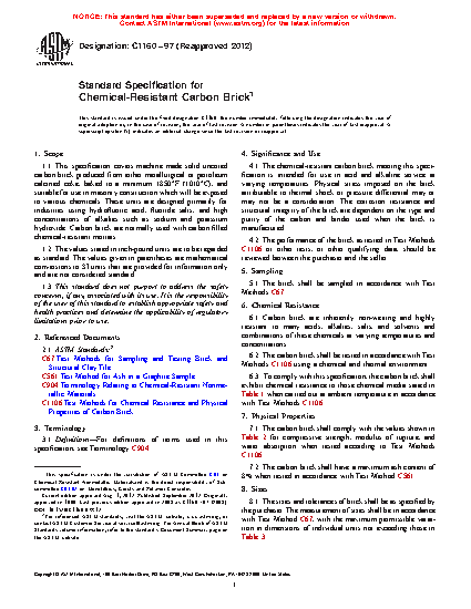 This specification covers machine made solid uncored carbon brick produced from either metallurgical or petroleum calcined coke, baked, and suitable for use in masonry construction. This material is normally used with carbon filled chemical-resistant mortars. The carbon brick shall exhibit chemical resistance to the following chemical media: nitric acid, hydrofluoric acid, hydrochloric acid, phosphoric acid, sulfuric acid, sodium hydroxide, and potassium hydroxide. It shall also comply with the specified values for compressive strength, modulus of rupture, water absorption, and maximum ash content.