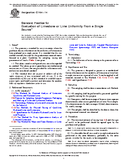 1.1 This practice is intended for use in instances where the purchaser desires information on the uniformity of limestone or lime produced at a single source. It is intended that this test method normally be used for the predominant material manufactured at a plant. Guidelines for sampling, testing and presentation of results (Table 1) are given.