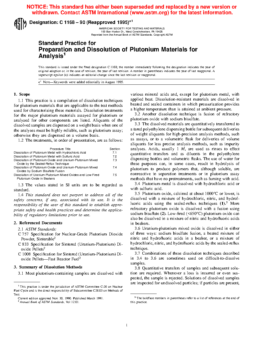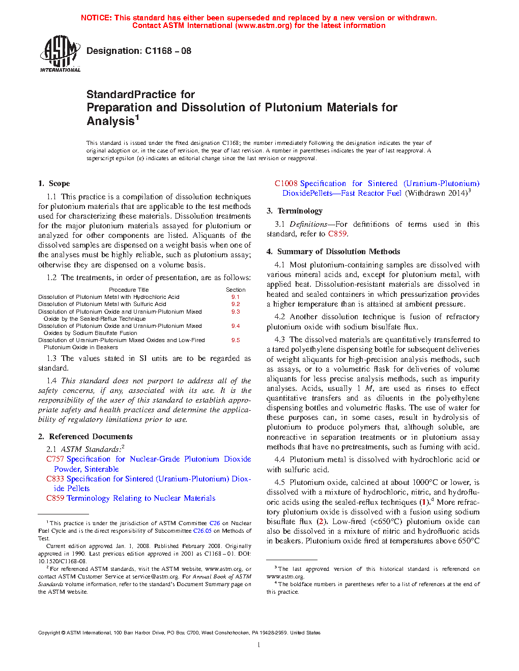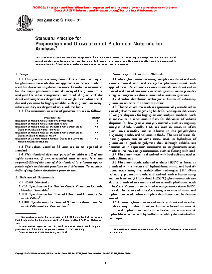 1.2 Procedures in this practice are intended for the dissolution of plutonium metal, plutonium oxide, and uranium-plutonium mixed oxides. Aliquots of dissolved materials are analyzed using test methods, such as those developed by Subcommittee C26.05 on Methods of Test, to demonstrate compliance with applicable requirements. These may include product specifications such as Specifications C757 and C833.