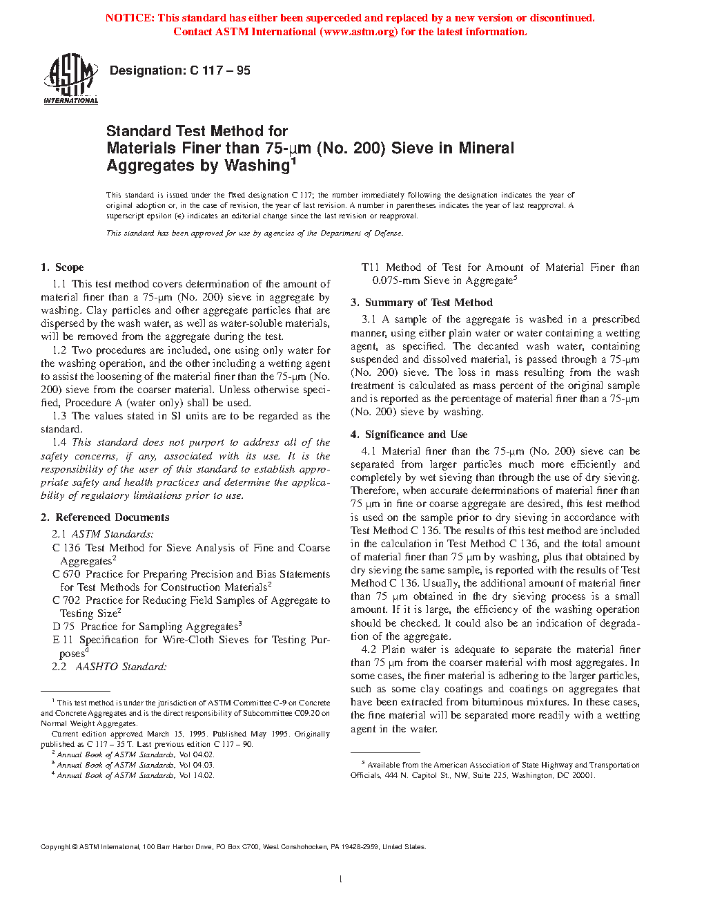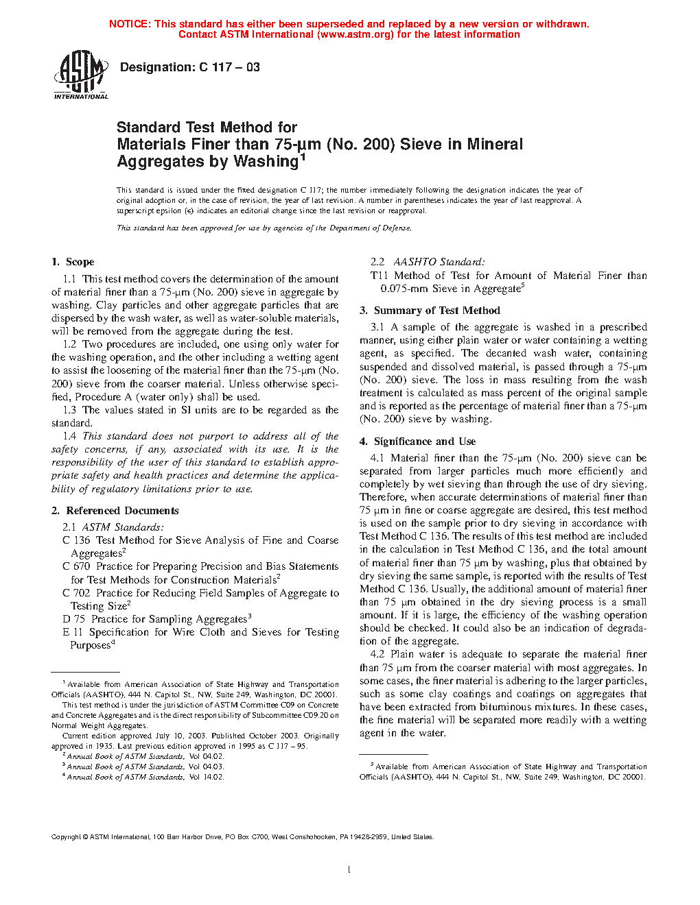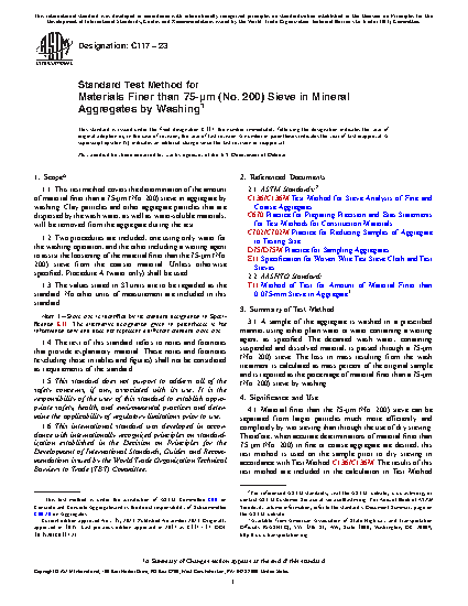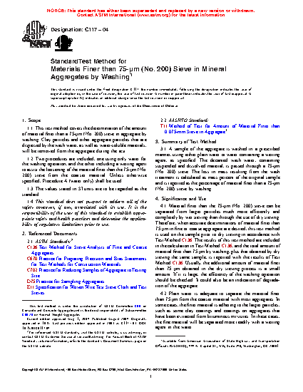 1.1 This test method covers determination of the amount of material finer than a 75-[mu]m (No. 200) sieve in aggregate by washing. Clay particles and other aggregate particles that are dispersed by the wash water, as well as water-soluble materials, will be removed from the aggregate during the test.