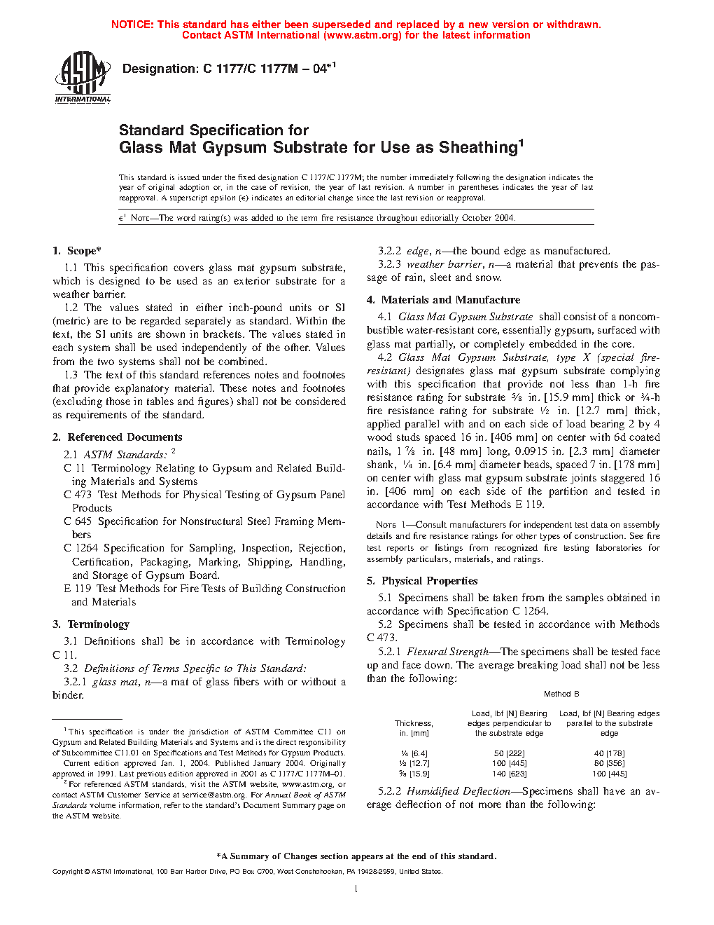 This specification covers the requirements for glass mat gypsum substrates designed to be used as exterior substrate or sheathing for weather barriers. The substrates shall consist of a noncombustible water-resistant gypsum core, surfaced with glass mat partially or completely embedded in the core. Materials shall be sampled, tested, and conform accordingly to specified physical property (flexural strength, humidified deflection, nail pull resistance, water resistance, and core, end, and edge hardness) and dimensional (thickness, width, length, end squareness, and edges) requirements.