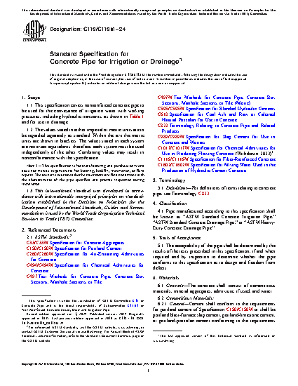 1.1 This specification covers nonreinforced concrete pipe to be used for the conveyance of irrigation water with working pressures, including hydraulic transients, as shown in Table 1 and for use in drainage.