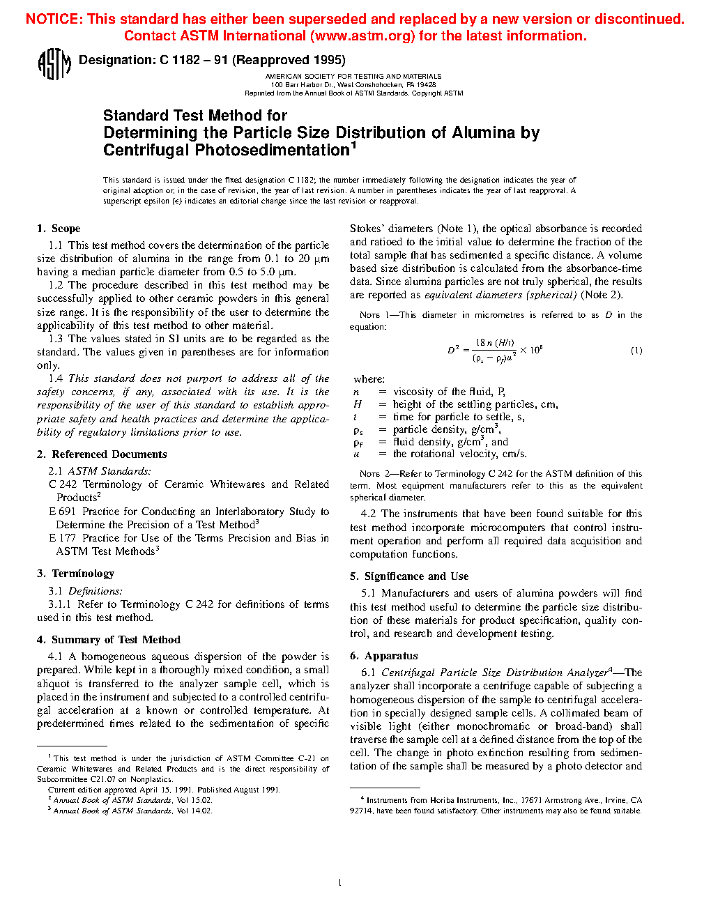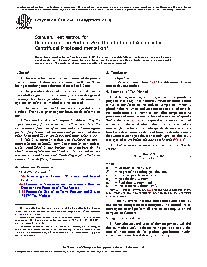 1.1 This test method covers the determination of the particle size distribution of alumina in the range from 0.1 to 20 μm having a median particle diameter from 0.5 to 5.0 μm.