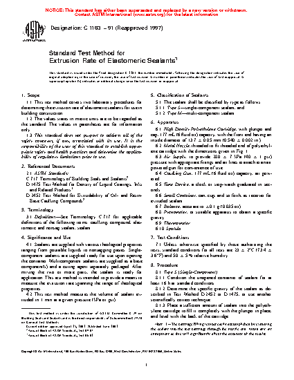 Sealants are supplied with various rheological properties ranging from pourable liquids to nonsagging pastes. Single-component sealants are supplied ready for use upon opening the container. Multicomponent sealants are supplied as a base component(s) and a curing agent separately packaged. After mixing the two or more parts, the sealant is ready for application. This test method is intended to provide a means to measure the extrusion rate spanning the range of rheological properties.