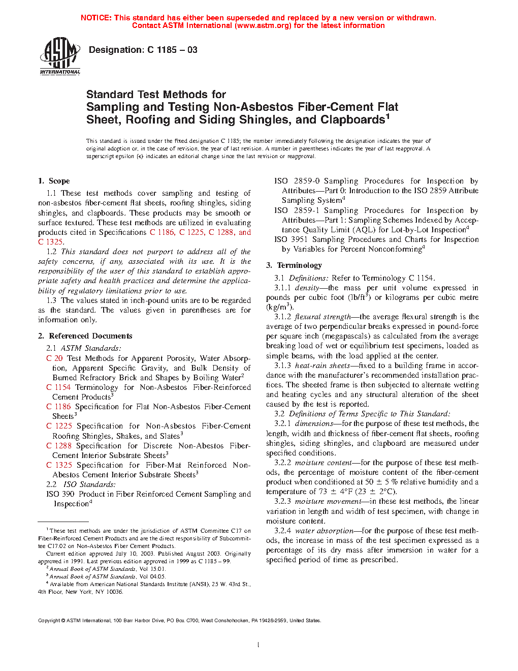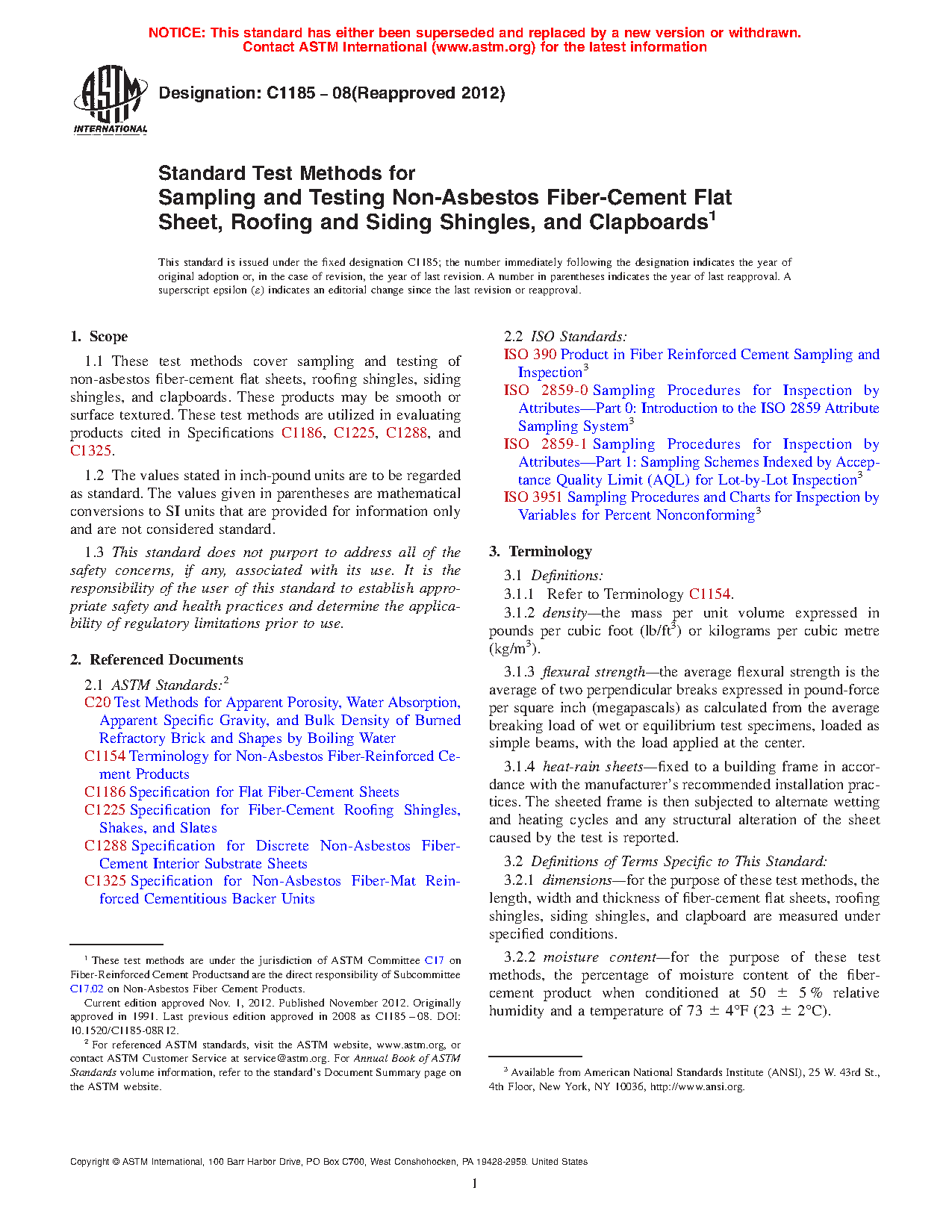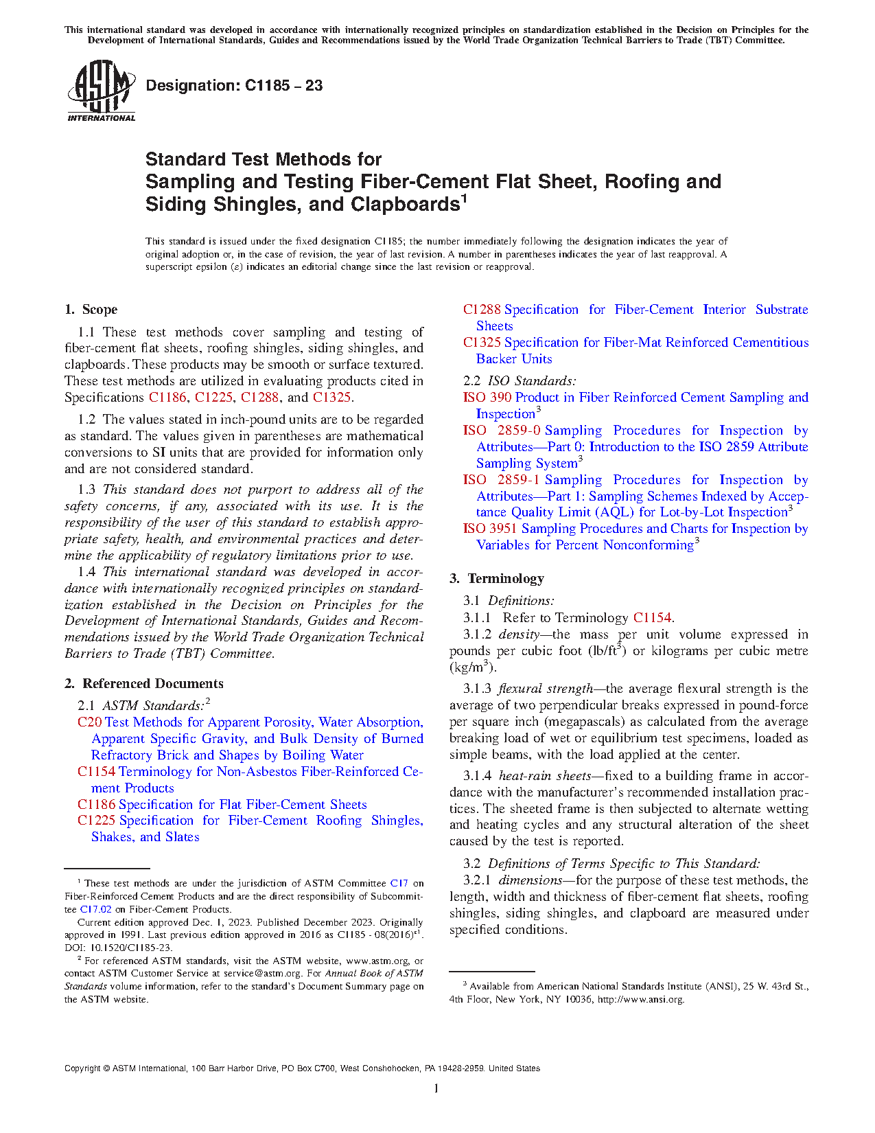 1.1 These test methods cover sampling and testing of fiber-cement flat sheets, roofing shingles, siding shingles, and clapboards. These products may be smooth or surface textured. These test methods are utilized in evaluating products cited in Specifications C1186, C1225, C1288, and C1325.
