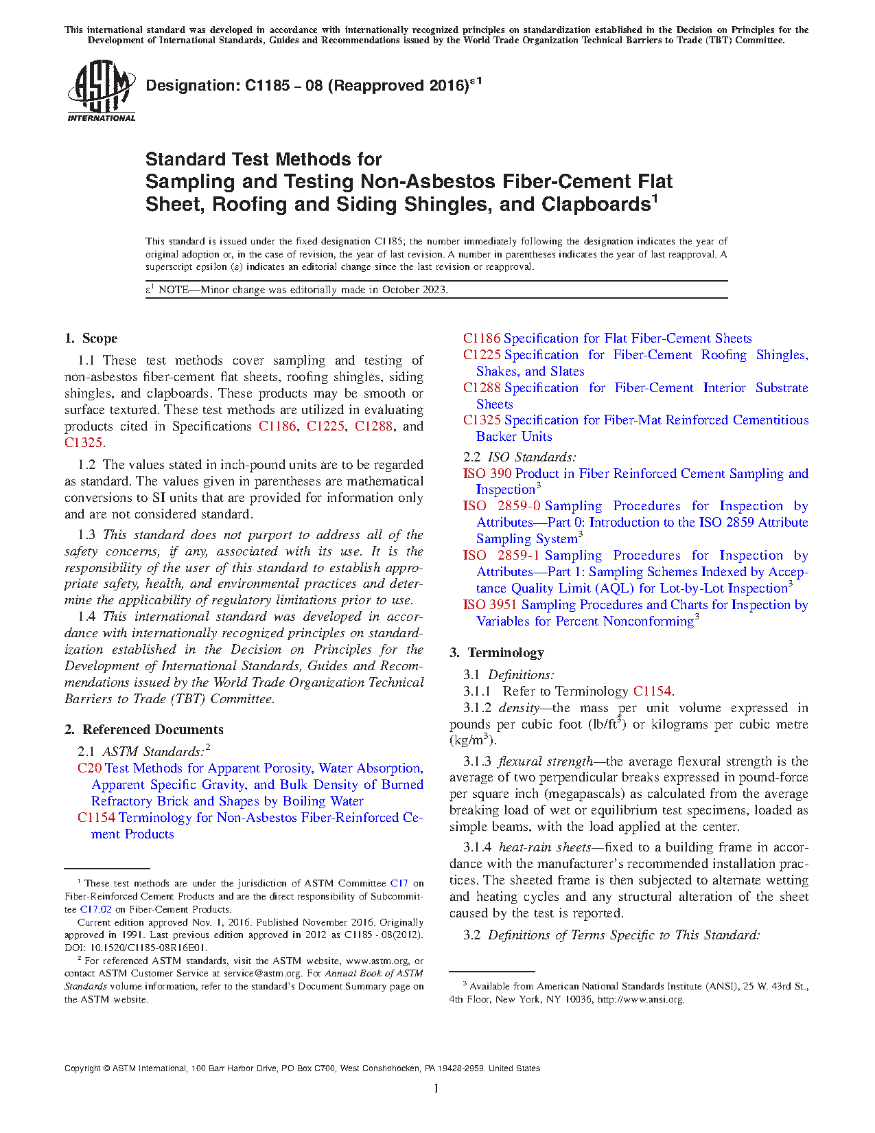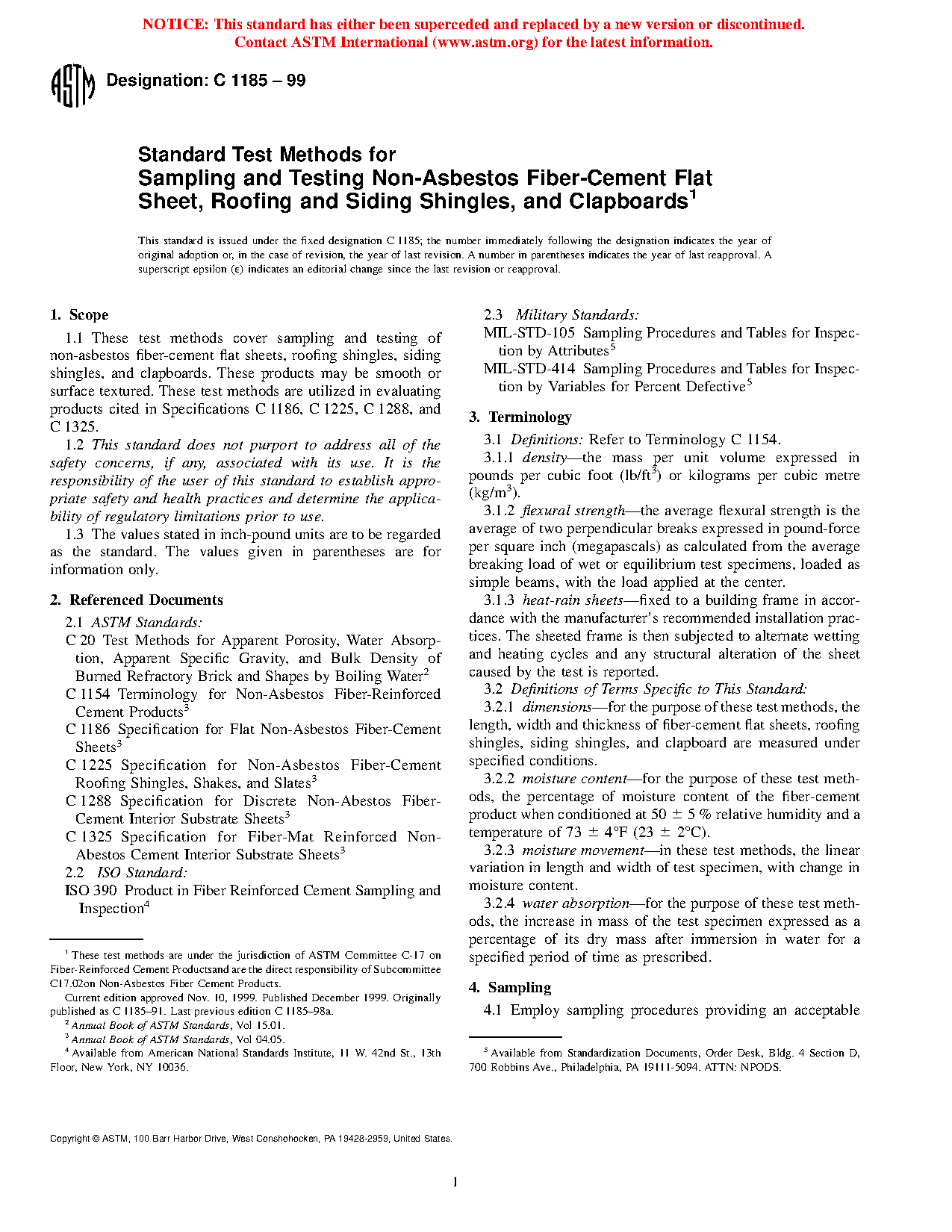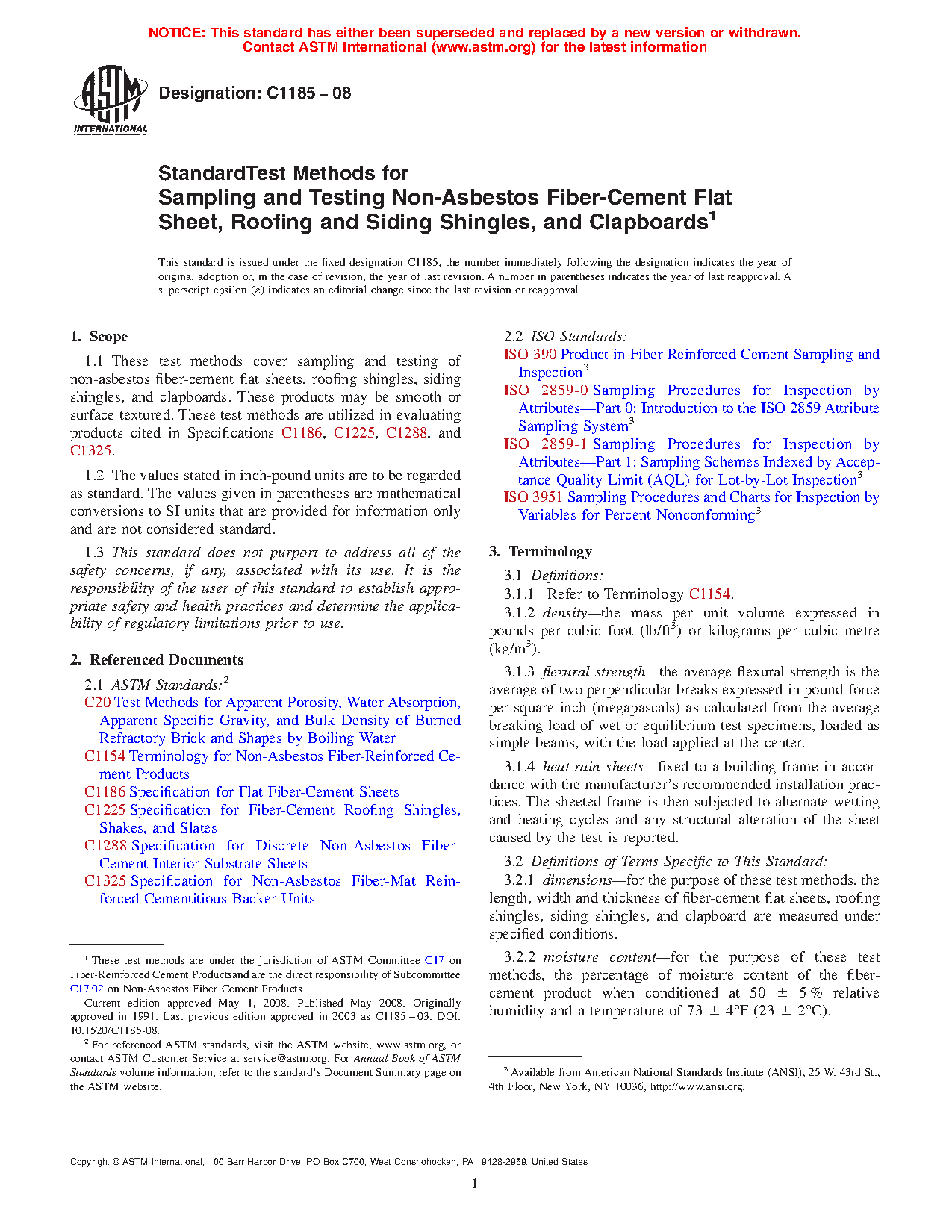 1.1 These test methods cover sampling and testing of fiber-cement flat sheets, roofing shingles, siding shingles, and clapboards. These products may be smooth or surface textured. These test methods are utilized in evaluating products cited in Specifications C1186, C1225, C1288, and C1325.