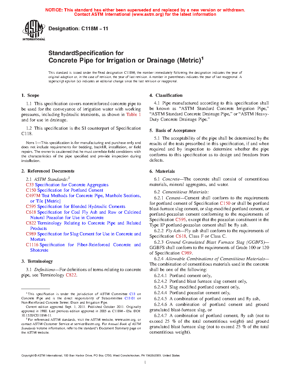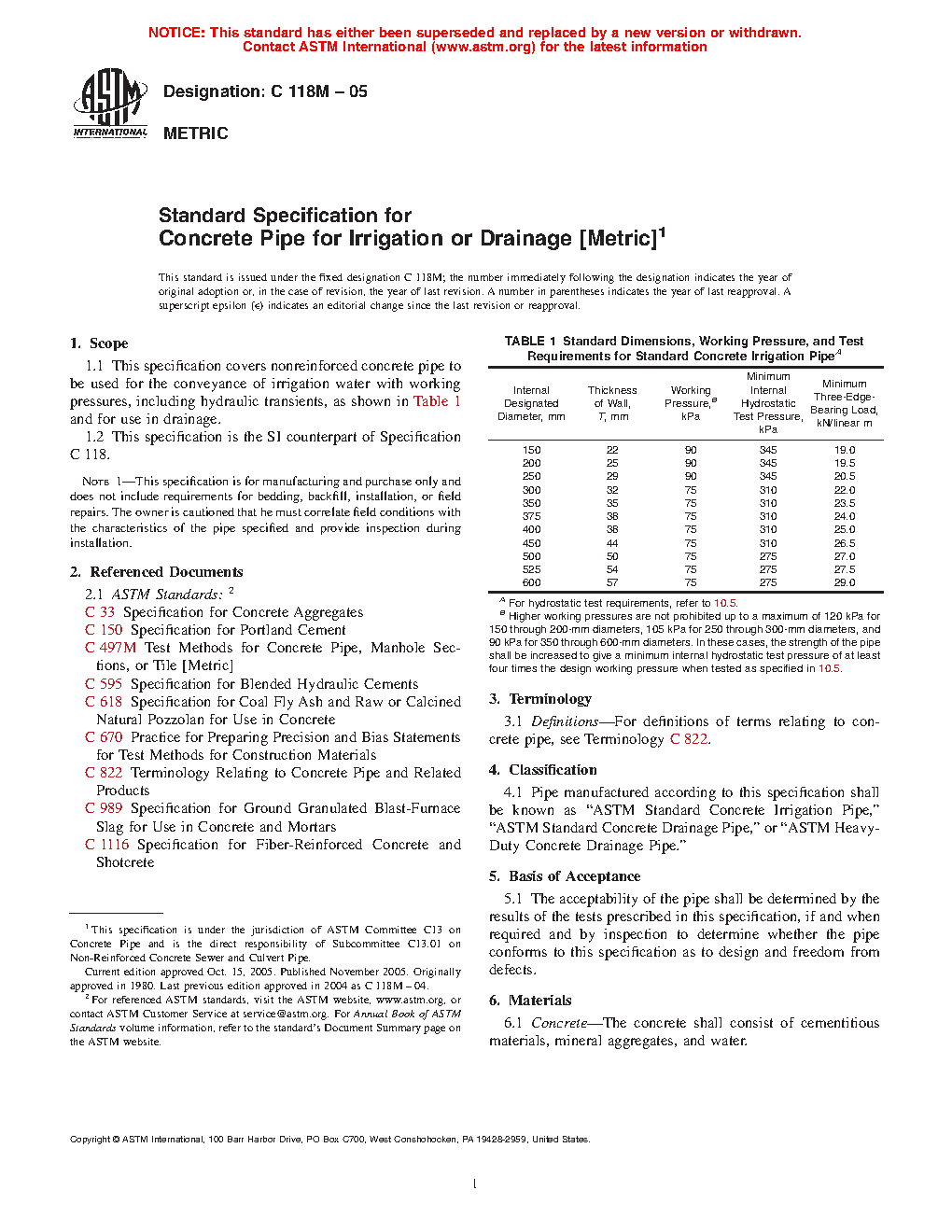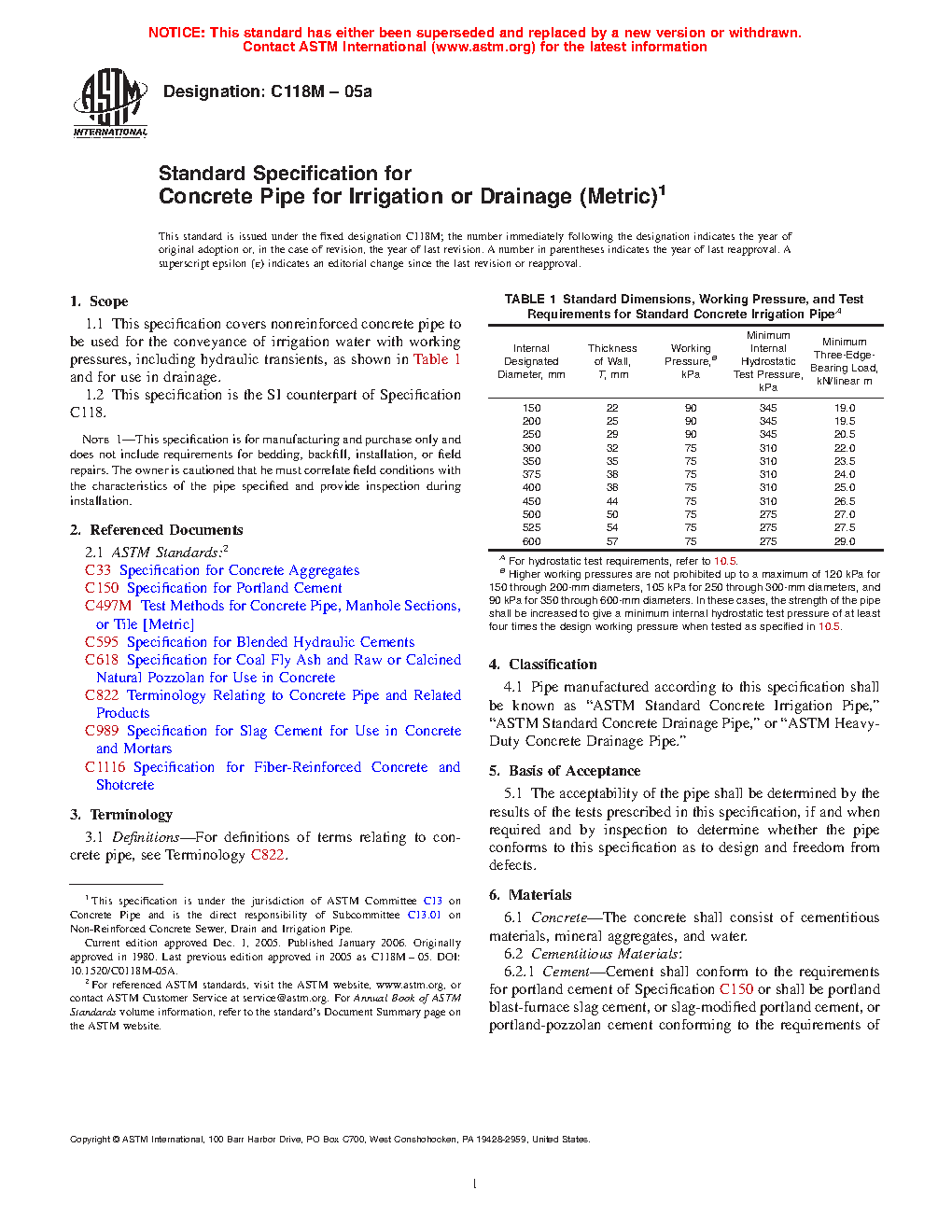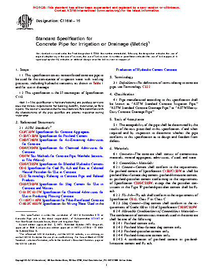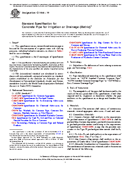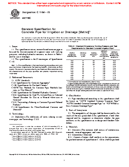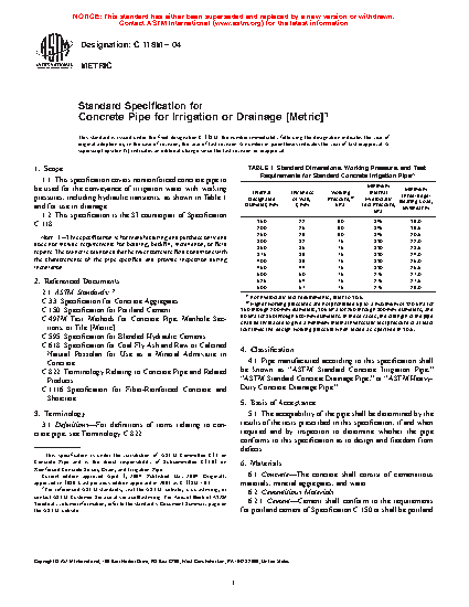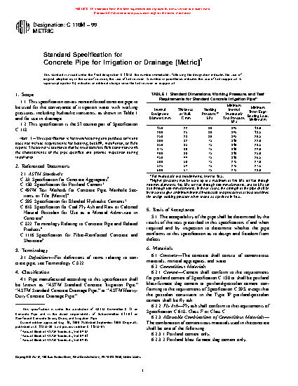 1.1 This specification covers nonreinforced concrete pipe to be used for the conveyance of irrigation water with working pressures, including hydraulic transients, as shown in Table 1 and for use in drainage.