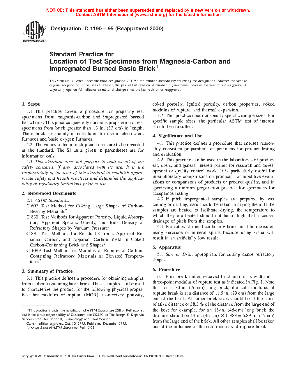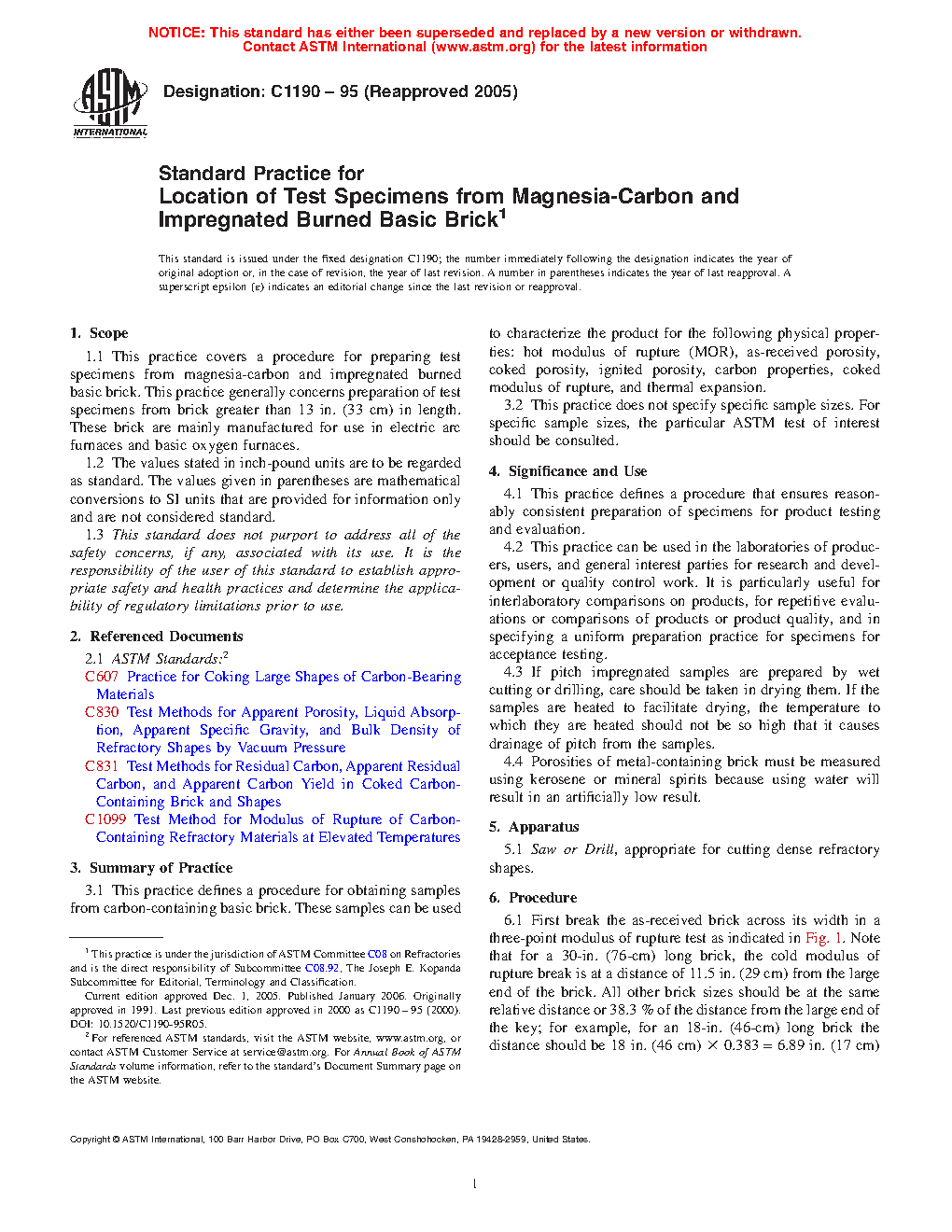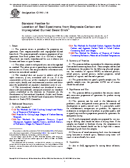 1.1 This practice covers a procedure for preparing test specimens from magnesia-carbon and impregnated burned basic brick. This practice generally concerns preparation of test specimens from brick greater than 13 in. (33 cm) in length. These brick are mainly manufactured for use in electric arc furnaces and basic oxygen furnaces.