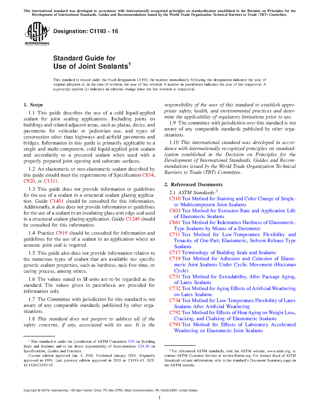 1.1 This guide describes the use of a cold liquid-applied sealant for joint sealing applications. Including joints on buildings and related adjacent areas, such as plazas, decks, and pavements for vehicular or pedestrian use, and types of construction other than highways and airfield pavements and bridges. Information in this guide is primarily applicable to a single and multi-component, cold liquid-applied joint sealant and secondarily to a precured sealant when used with a properly prepared joint opening and substrate surfaces.