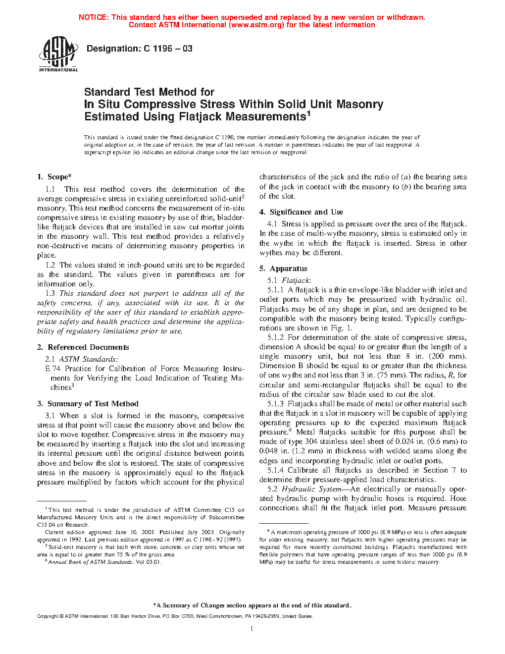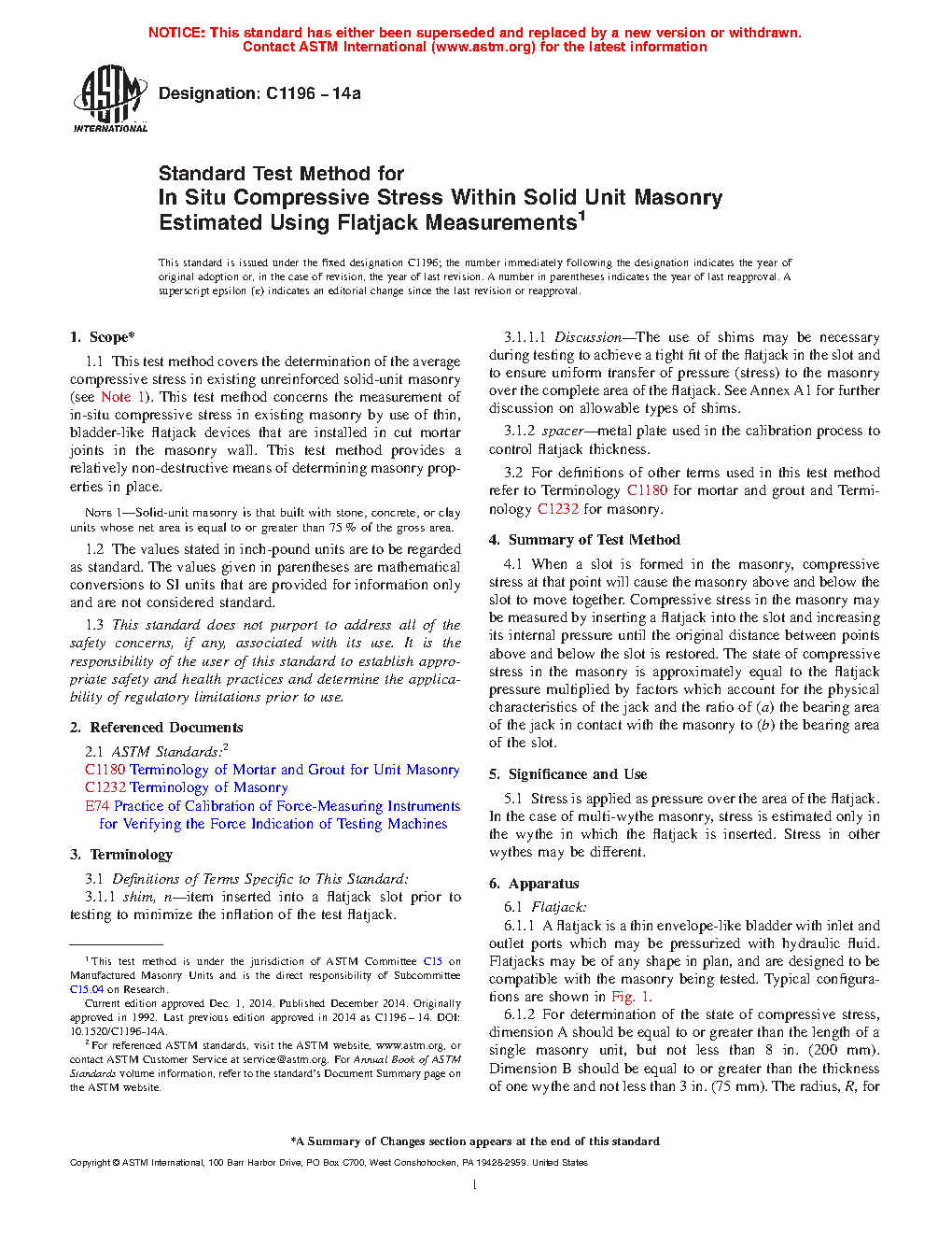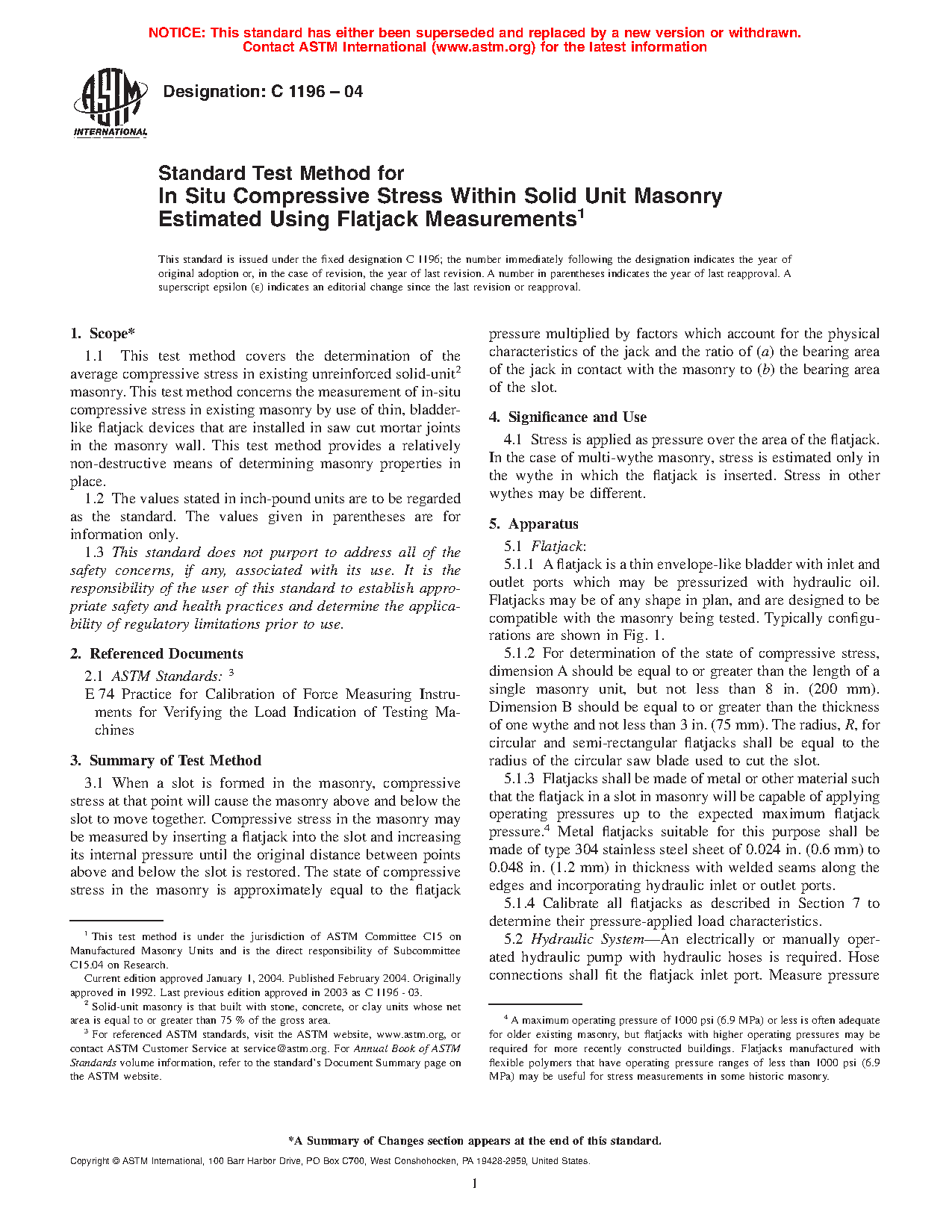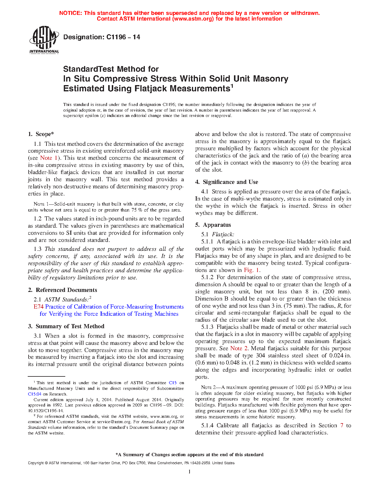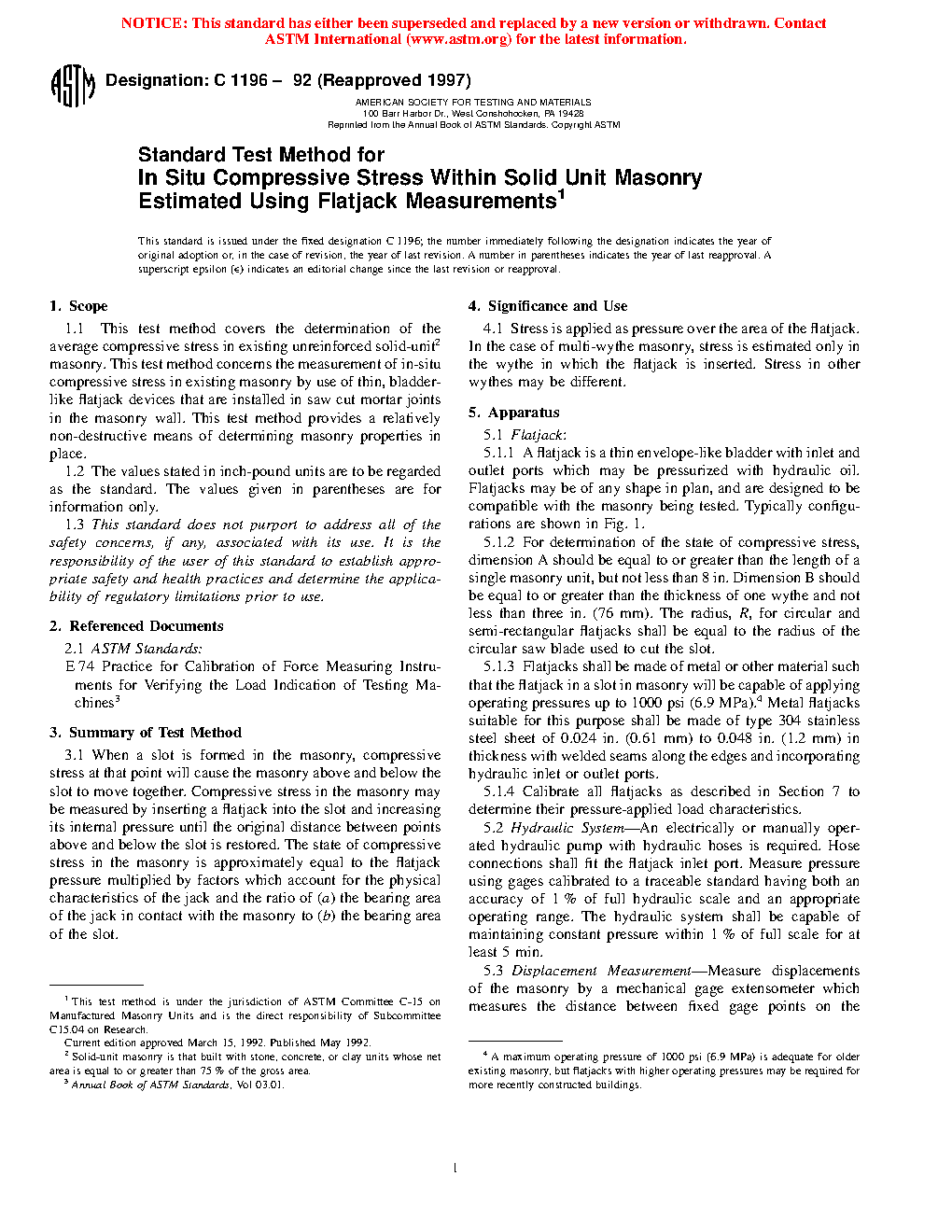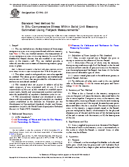 1.1 This test method covers the determination of the average compressive stress in existing unreinforced solid-unit masonry (see Note 1). This test method concerns the measurement of in-situ compressive stress in existing masonry by use of thin, bladder-like flatjack devices that are installed in cut mortar joints in the masonry wall. This test method provides a relatively non-destructive means of determining masonry properties in place.