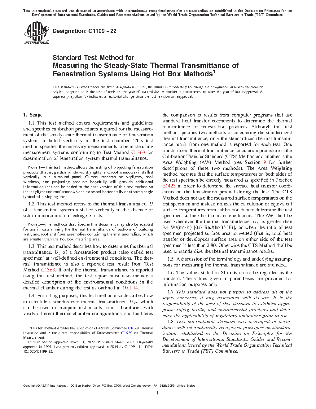 1.3 This test method describes how to determine the thermal transmittance, US of a fenestration product (also called test specimen) at well-defined environmental conditions. The thermal transmittance is also a reported test result from Test Method C1363. If only the thermal transmittance is reported using this test method, the test report must also include a detailed description of the environmental conditions in the thermal chamber during the test as outlined in 10.1.14.