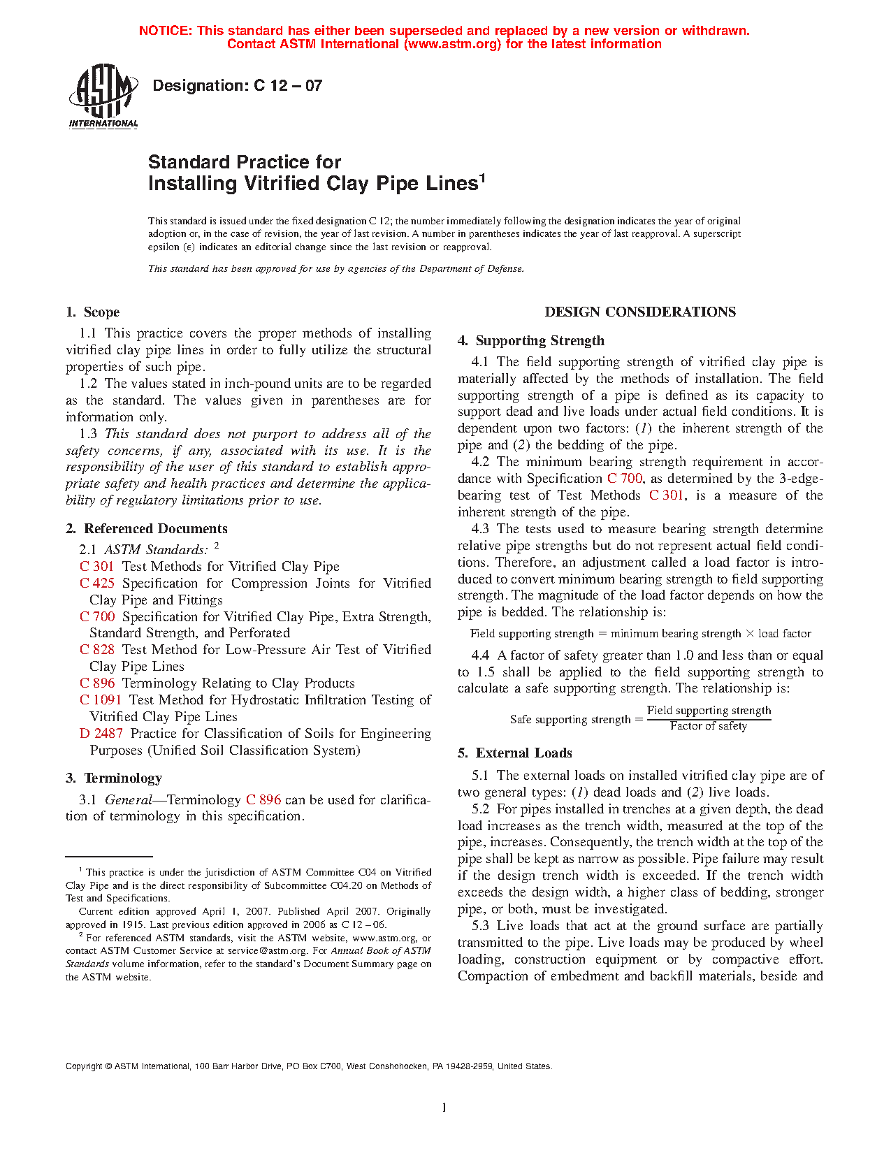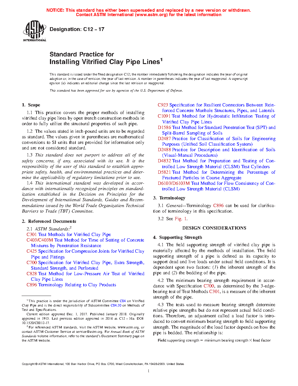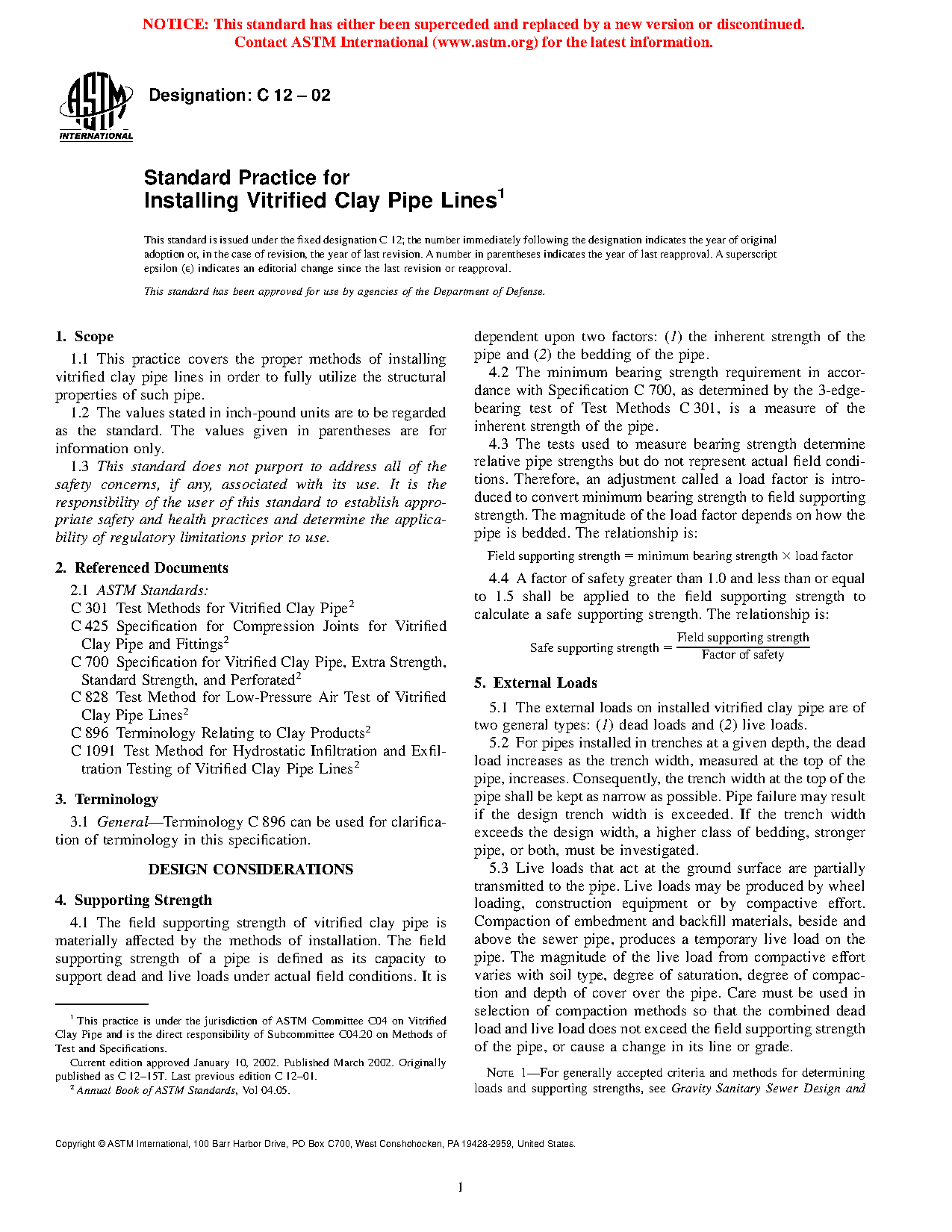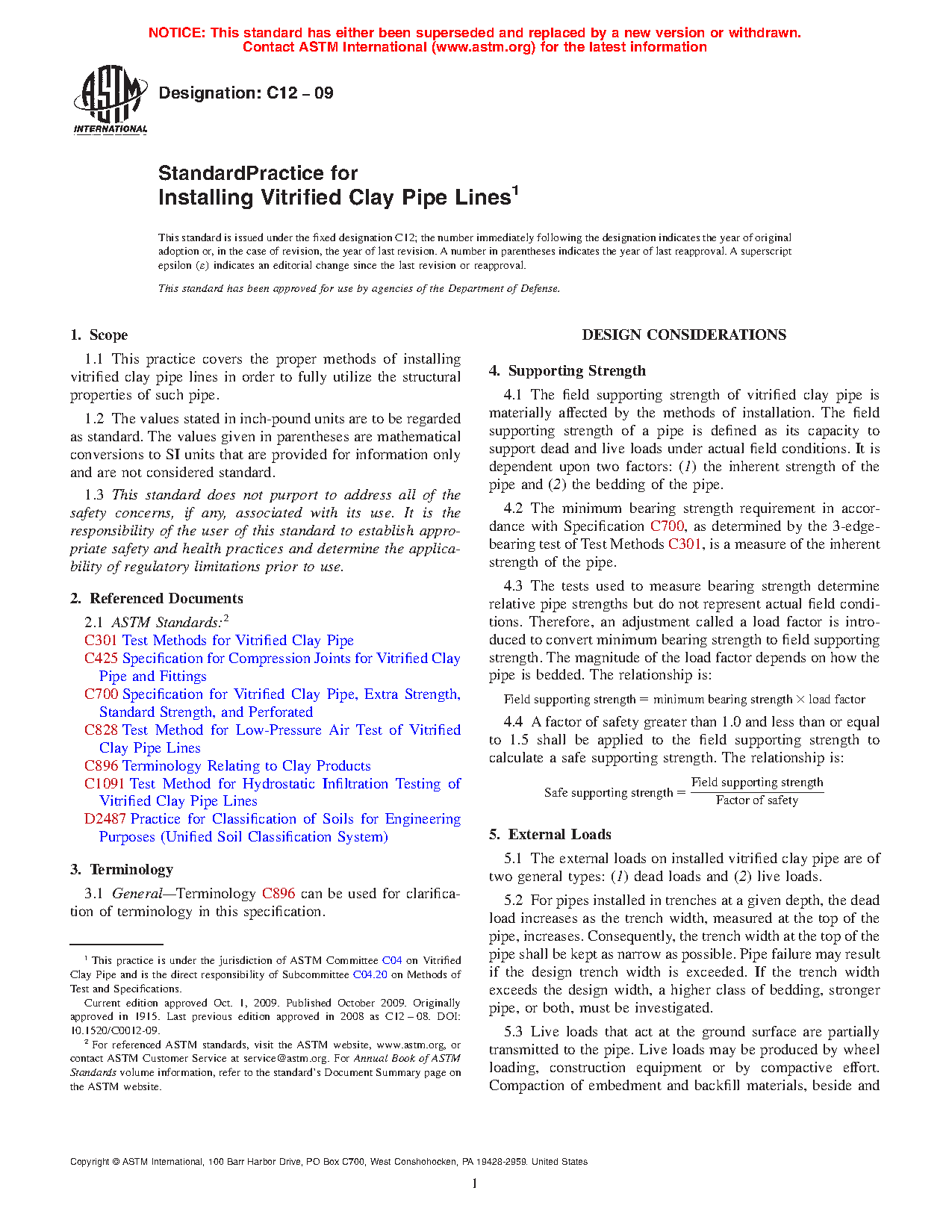 1.1 This practice covers the proper methods of installing vitrified clay pipe lines by open trench construction methods in order to fully utilize the structural properties of such pipe.