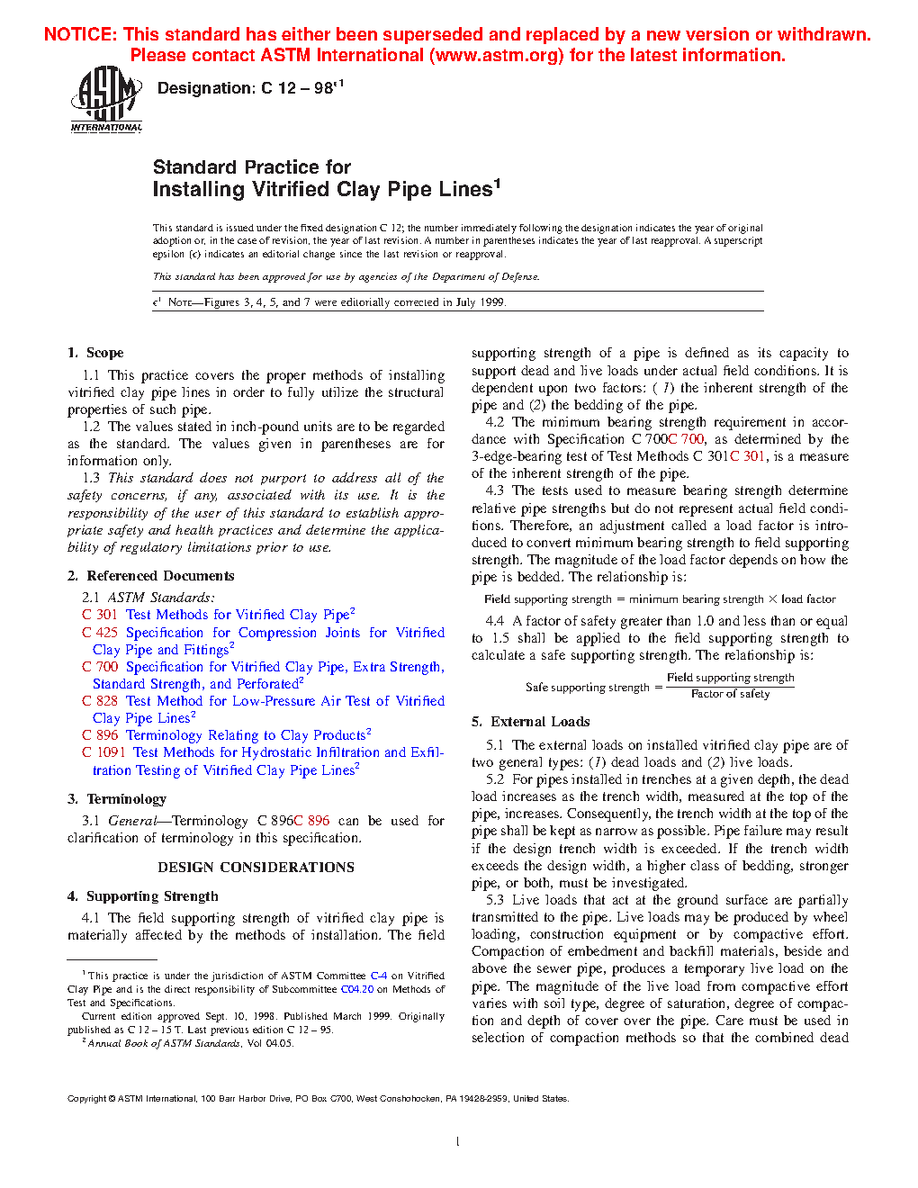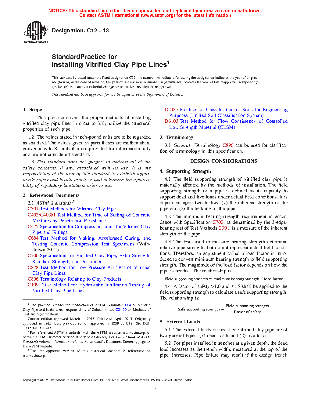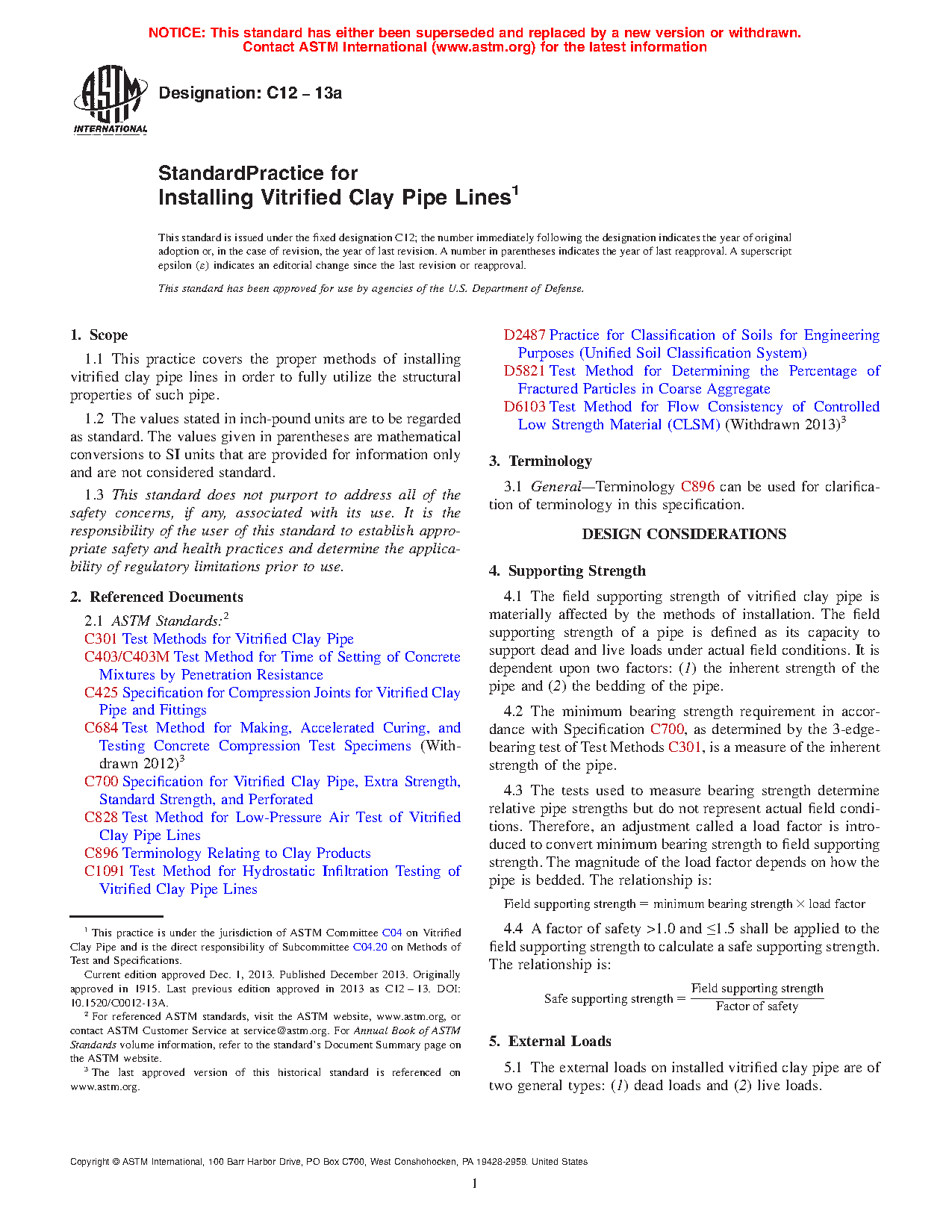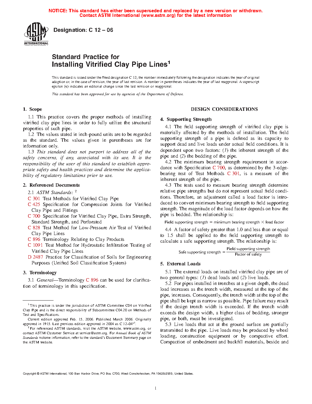 1.1 This practice covers the proper methods of installing vitrified clay pipe lines by open trench construction methods in order to fully utilize the structural properties of such pipe.