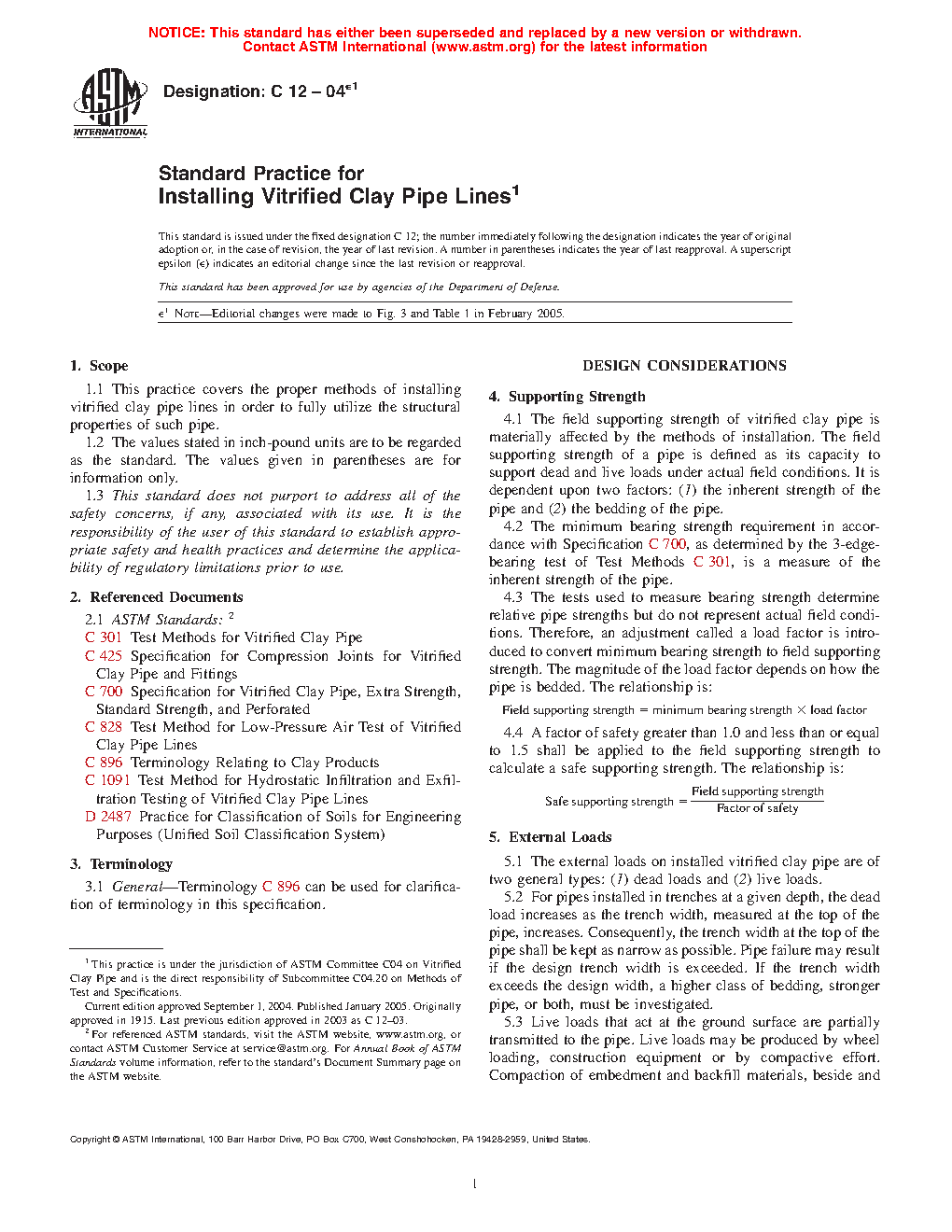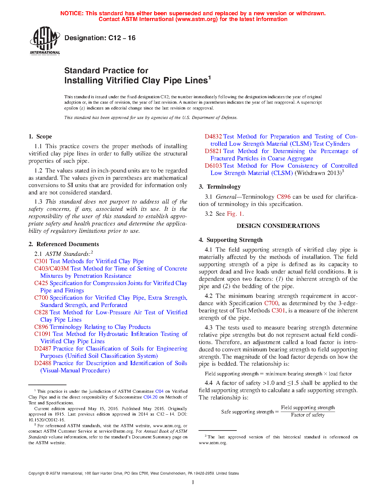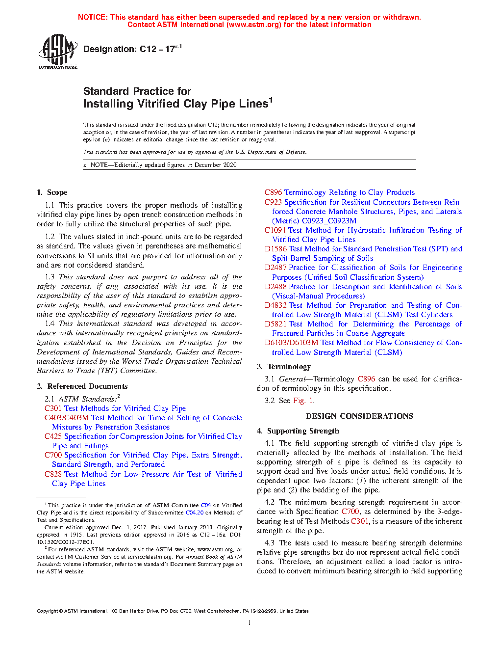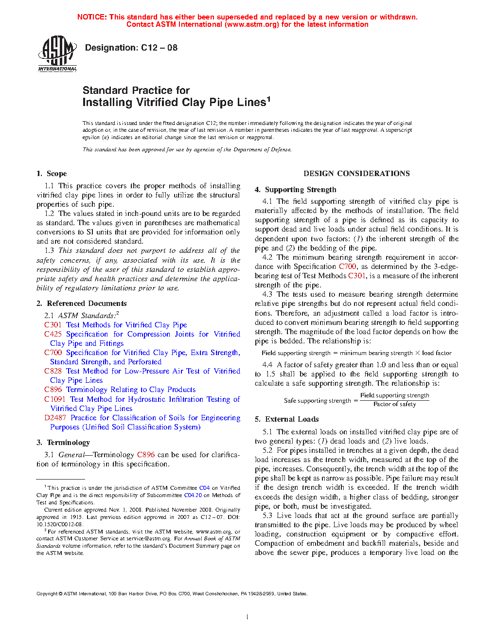 1.1 This practice covers the proper methods of installing vitrified clay pipe lines by open trench construction methods in order to fully utilize the structural properties of such pipe.