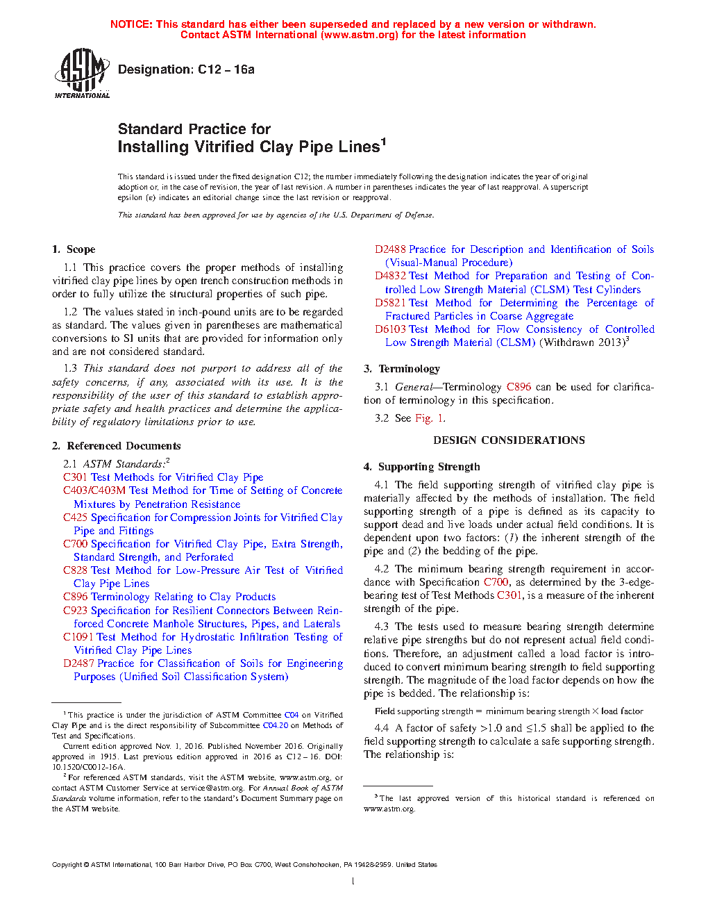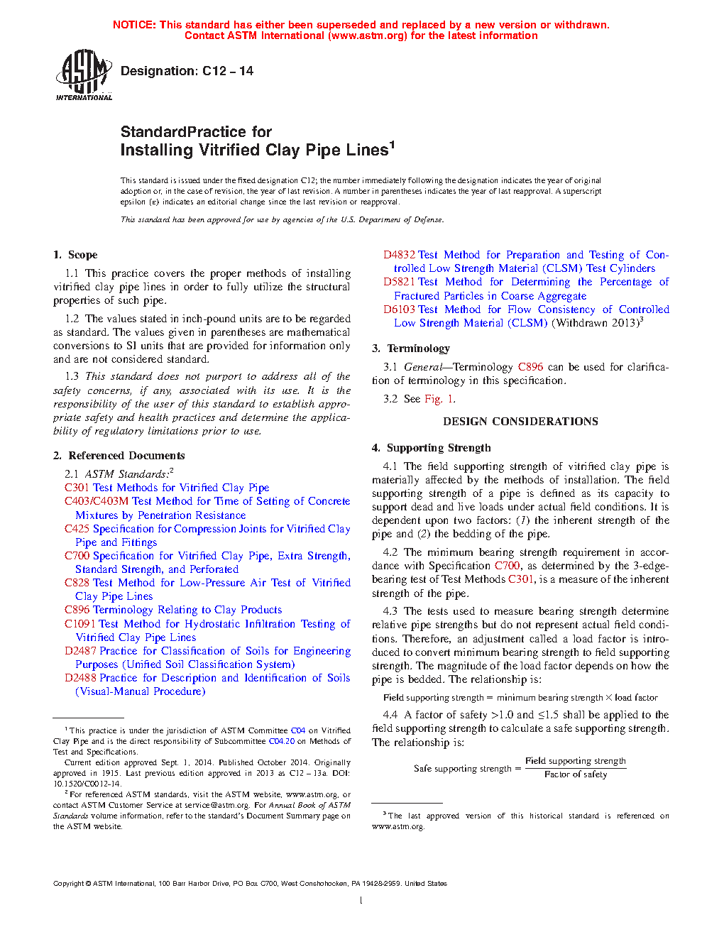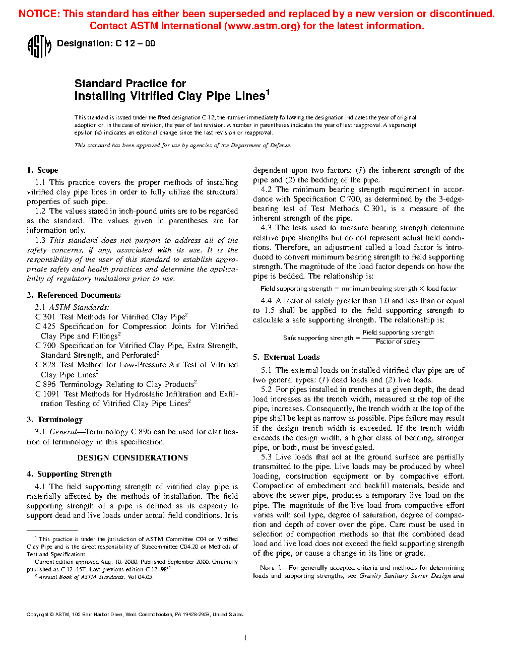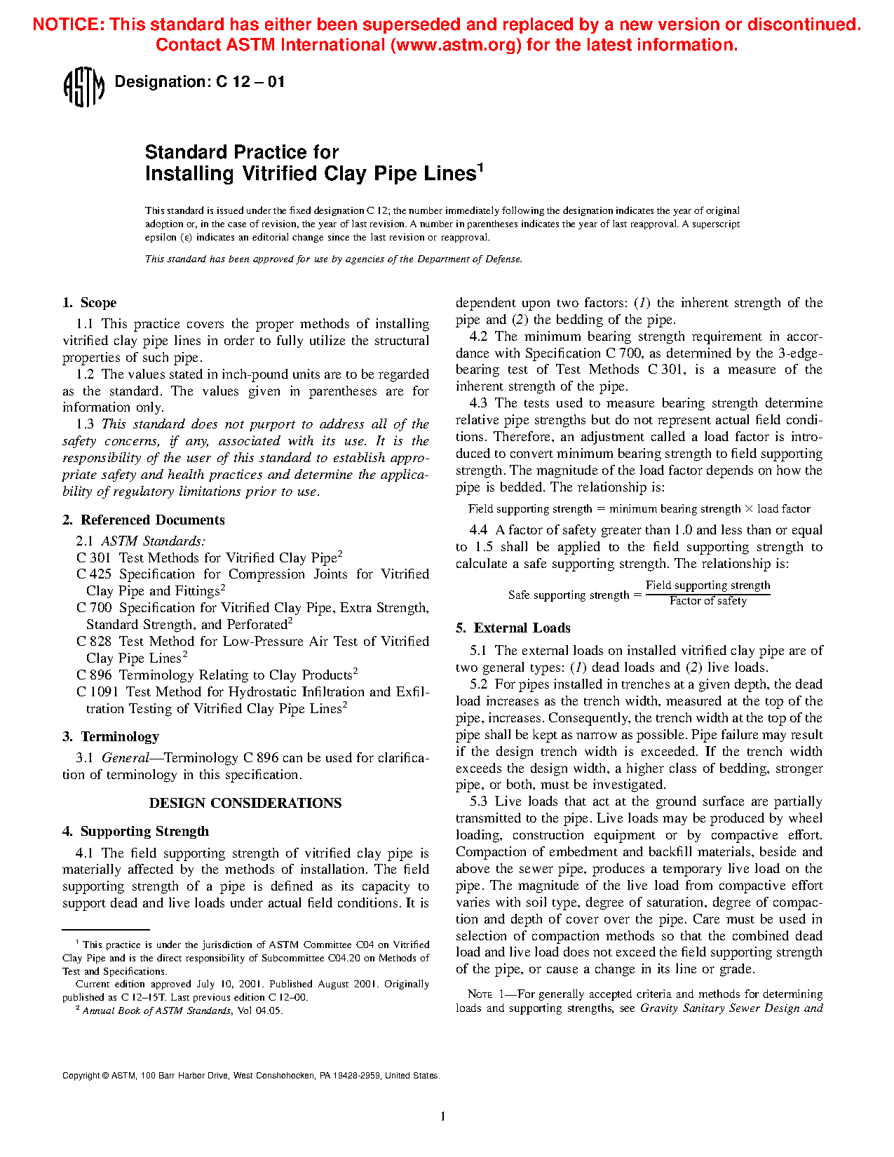 1.1 This practice covers the proper methods of installing vitrified clay pipe lines by open trench construction methods in order to fully utilize the structural properties of such pipe.