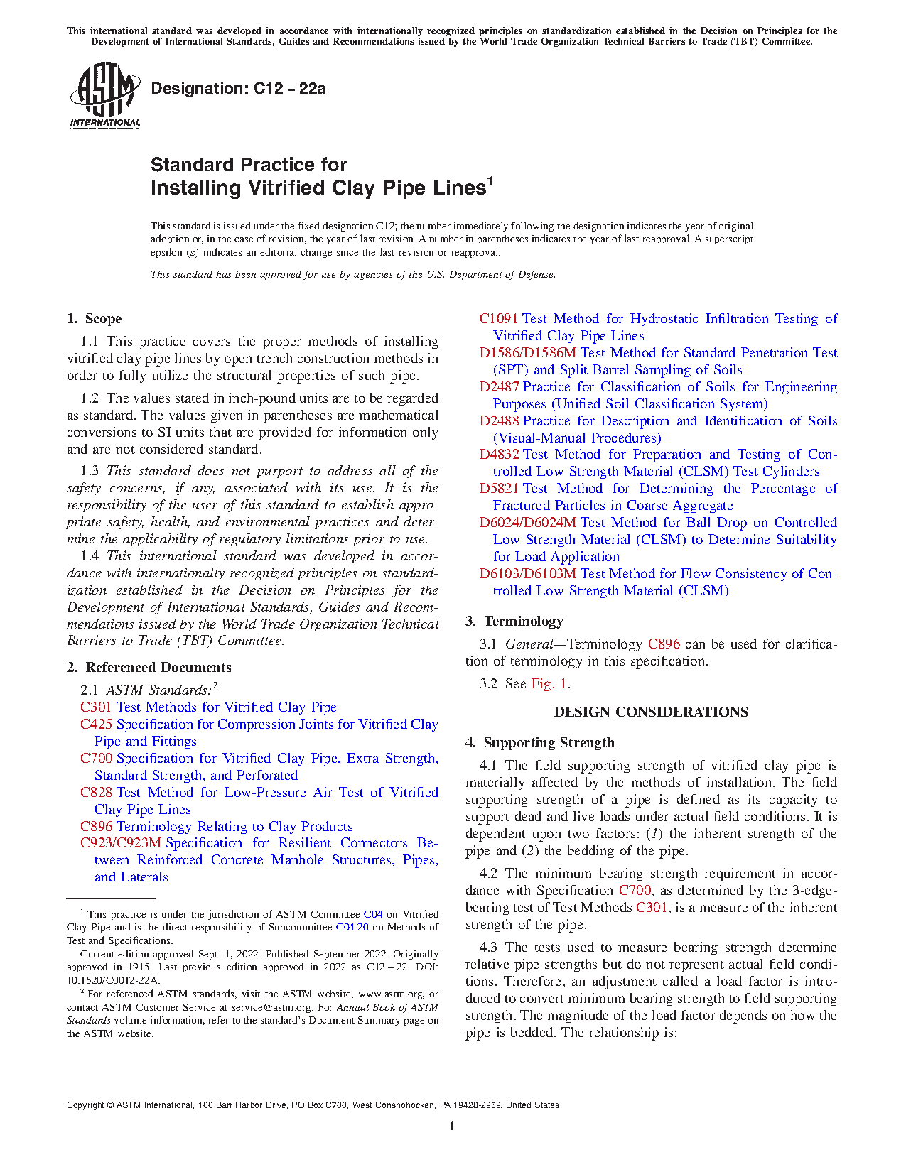 1.1 This practice covers the proper methods of installing vitrified clay pipe lines by open trench construction methods in order to fully utilize the structural properties of such pipe.